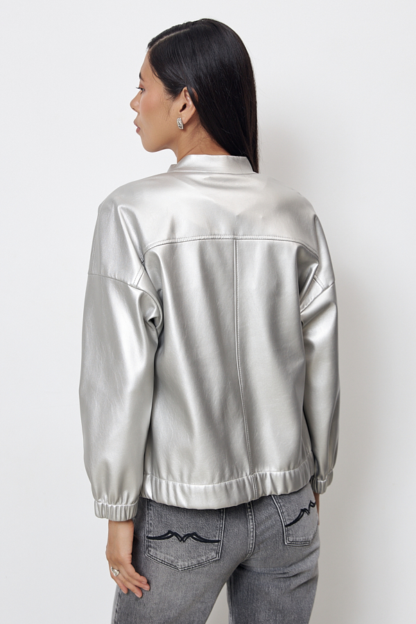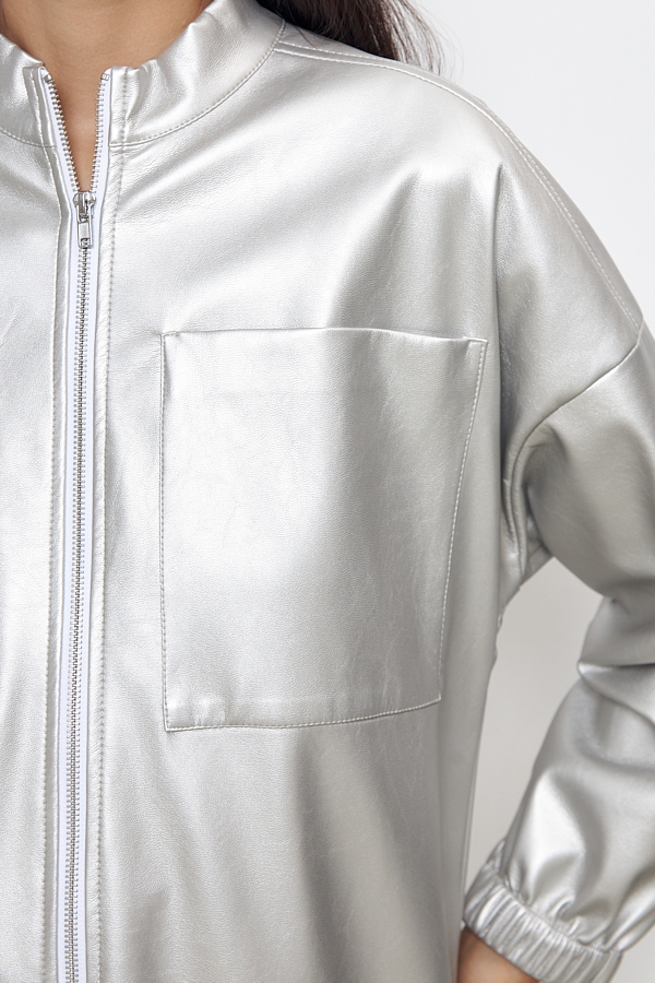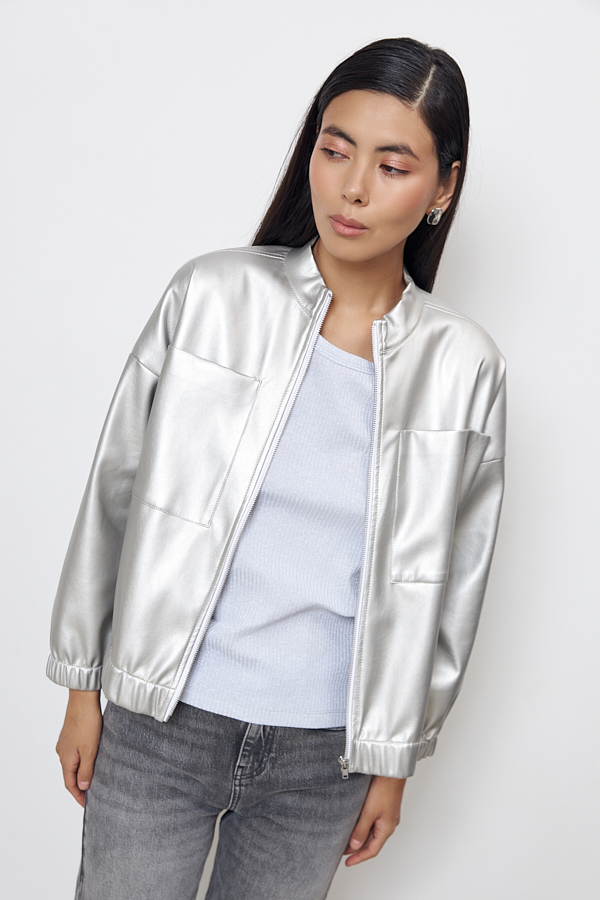 Жакет-бомбер из эластичного полотна, с покрытием, имитирующим кожу. Свободный силуэт с застёжкой-молнией и накладными карманами. Рукав втачной в спущенную пройму. Нижняя часть рукава и низ изделия присборены на резинку. Линия горловины оформлена воротником-стойкой.