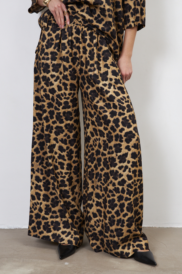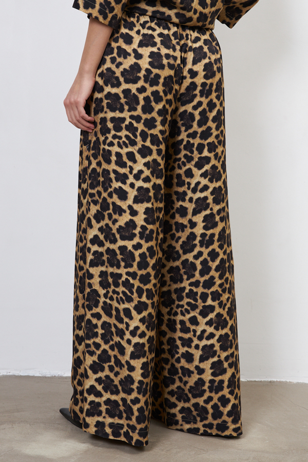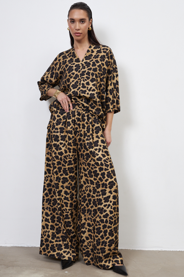 Брюки из вискозной ткани свободного силуэта. Пояс с эластичной резиной, в боковых швах карманы.