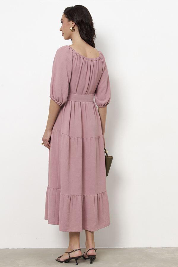 Платье свободного силуэта из ткани с крэш-эффектом, отрезное по линии талии. Нижняя части платья с воланами. Рукав-реглан до локтя. По низу рукава сборка на резину. Линия плеча и линия горловина оформлены сборкой на резину. В комплекте пояс из основной ткани.