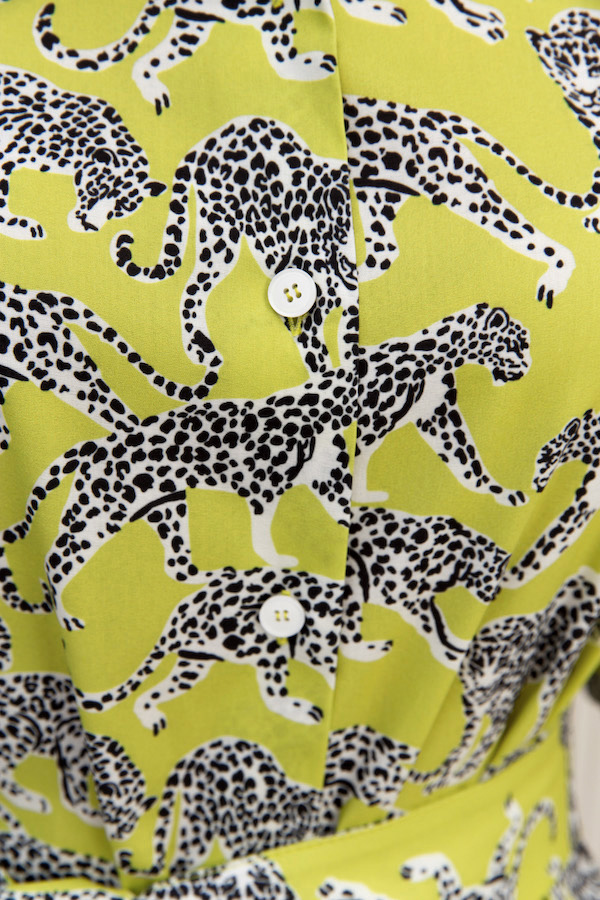 Платье-рубашка из вискозной ткани свободного силуэта, с застёжкой на пуговицы. Короткий втачной рукав в спущенную пройму. Вырез горловины обработан отложным воротником на стойке. На передней части изделия выполнены накладные карманы. В комплекте пояс из основной ткани.