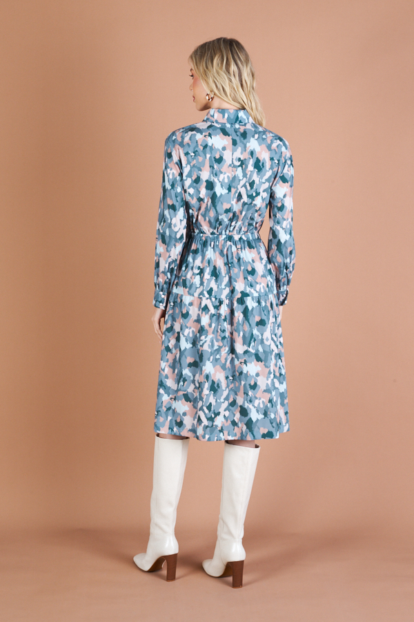 Платье свободного силуэта из струящейся плательной ткани. Изделие по линии талии на резинке, на юбке-сборка. V-образный вырез горловины обработан отложным воротником на стойке. Втачной длинный рукав с манжетой, застегивающейся на пуговицы.