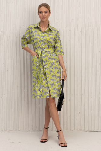 Платье свободного силуэта из вискозной плательной ткани. Изделие отрезное по линии талии, с ярусами на юбке. V-образный вырез горловины обработан воротником-стойкой. Втачной рукав на манжете с застёжкой на пуговицы. В комплекте пояс из основной ткани. В таблице размеров представлены параметры человека, а не изделия.