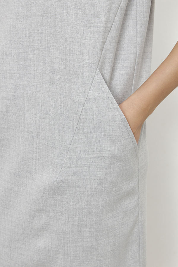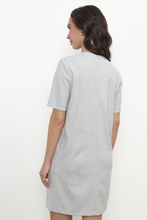 Платье свободного силуэта из плательной ткани. На передней части изделия выполнены декоративные рельефы и карманы. Втачной короткий рукав. Круглый вырез горловины, по среднему шву спинки застёжка на молнию.