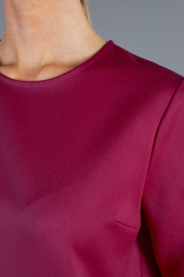 Платье свободного силуэта из плательной ткани. На передней части изделия выполнены декоративные рельефы и карманы. Втачной короткий рукав. Круглый вырез горловины, по среднему шву спинки застёжка на молнию.