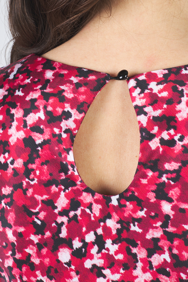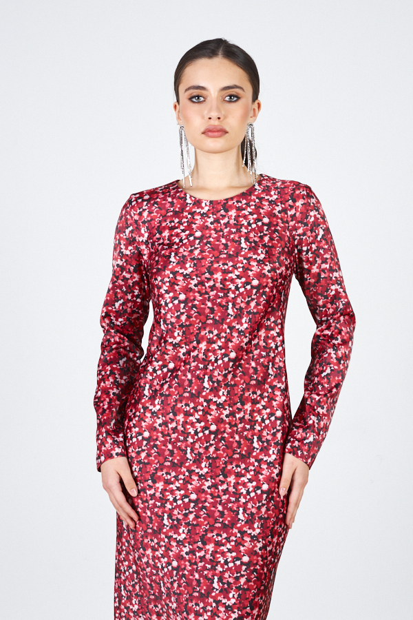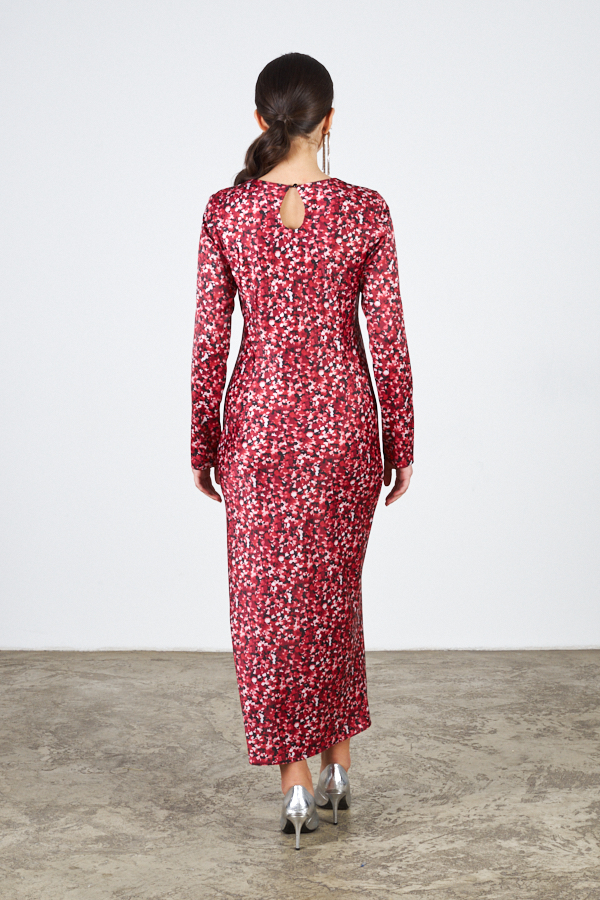 Платье прилегающего силуэта из атласной ткани. Крой платья по косой. Втачной длинный рукав. Круглый вырез горловины, сзади застёжка на петлю-пуговицу.