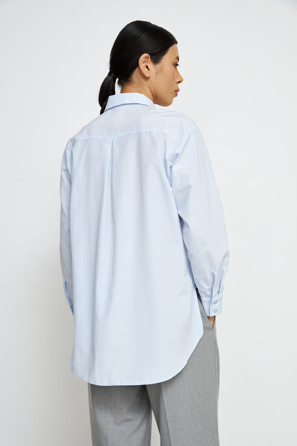 Рубашка свободного силуэта из хлопковой ткани с застёжкой на планке. Низ изделия асимметричной длины (спинка удлинена относительно переда) с закруглениями по бокам и разрезами. Рубашечный рукав на манжете с застёжкой на пуговицы. Вырез горловины обработан отложным воротником на стойке. На задней части изделия выполнена кокетка с небольшой складкой. На передней-накладной карман в области груди. Достоинство этой модели в способности скрыть некоторые недостатки фигуры. Её можно сочетать как с брюками, так и с джинсами.