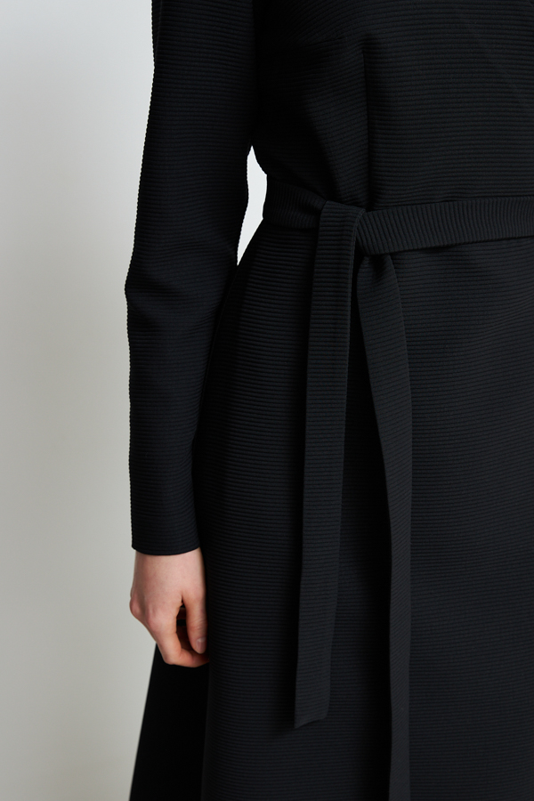 Платье отрезное по линии талии из фактурной плательной ткани. Изделие, прилегающее в верхней части и расширенное книзу. Глубокий V-образный вырез горловины плавно переходит в запах, фиксируется притачным поясом. Втачной длинный рукав.