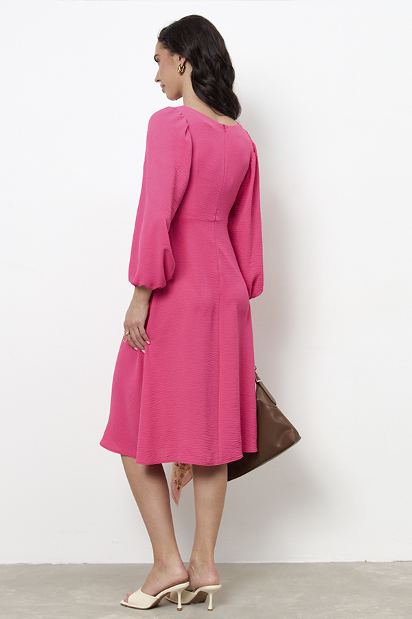 Платье приталенного силуэта, расширенное книзу из ткани с крэш-эффектом. Отрезное по линии талии. Верхняя часть с отрезным лифом, подрез фигурный. По верхнему краю лифа кулиска, в которую вставлены бретели-завязки, формирующие драпировку. Вырез горловины глубокий, расширенный, по форме напоминающий каре, с вырезом до линии подреза. Прилегание платья создано за счет рельефов на деталях переда и вытачек на деталях верхней и нижней части спинки. В верхней части среднего шва спинки застежка на потайную молнию. Рукава втачные, длинные, со сборкой по окату и низу рукава. В подгибку низа рукава вставлена резинка.