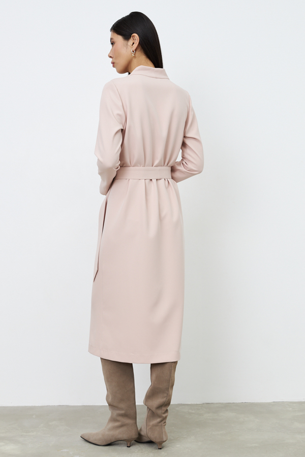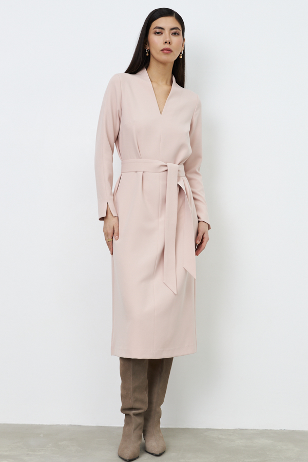Платье свободного силуэта из плательной ткани. По центру передней части изделия выполнен шов. Цельнокроеная стойка, переходящая в V-образный вырез горловины, визуально делает фигуру стройнее. Втачной длинный рукав с центральным швом и декоративным разрезом по низу рукава. В комплекте пояс из основной ткани.