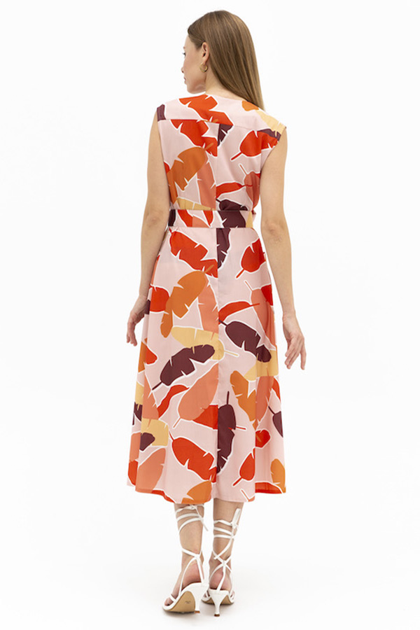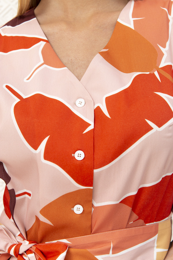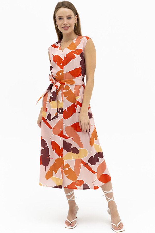 Платье из вискозной ткани полуприлегающее в области груди и свободное в области бедер. Изделие отрезное по линии талии с застёжкой на пуговицы и накладными карманами. На задней части платья выполнена кокетка. V-образный вырез горловины, визуально делает фигуру стройнее. В комплекте пояс из основной ткани.