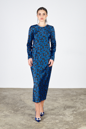 Платье прилегающего силуэта из атласной ткани. Крой платья по косой. Втачной длинный рукав. Круглый вырез горловины, сзади застёжка на петлю-пуговицу.