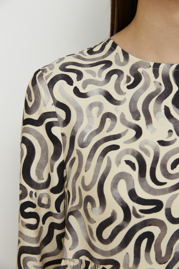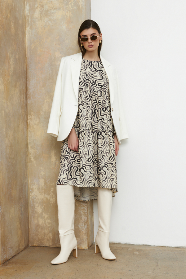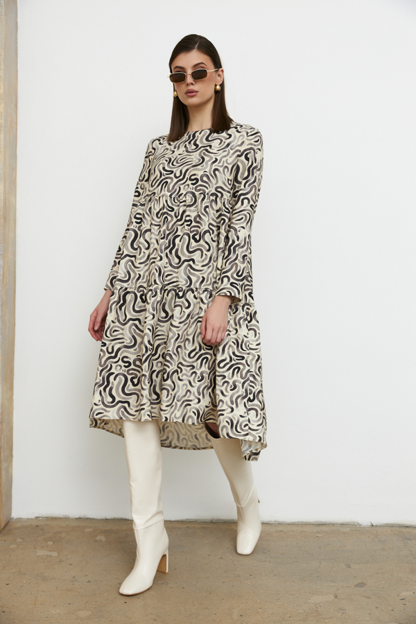 Платье очень свободного силуэта из вискозной плательной ткани. Изделие отрезное по линии талии, с ярусами на юбке. Линия талия завышена. Втачной длинный рукав. Круглый вырез горловины, сзади застёжка на петлю-пуговицу. Низ изделия асимметричной длины (спинка удлинена относительно переда). В таблице размеров представлены параметры человека, а не изделия.