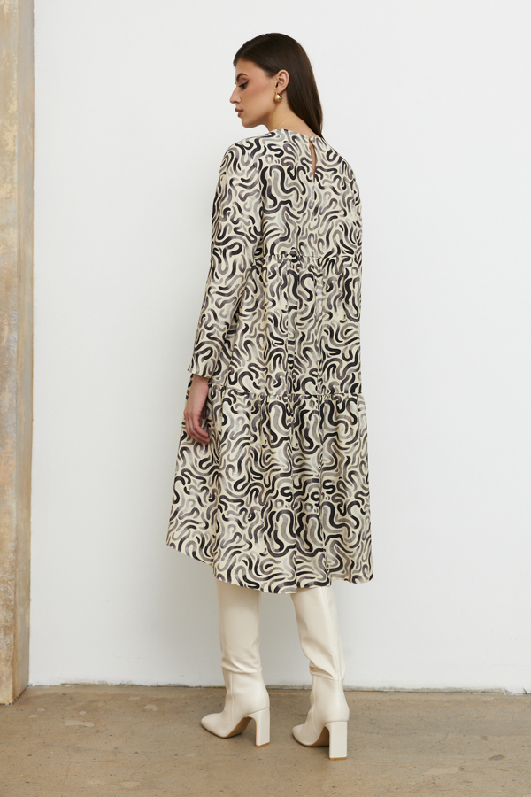 Платье очень свободного силуэта из вискозной плательной ткани. Изделие отрезное по линии талии, с ярусами на юбке. Линия талия завышена. Втачной длинный рукав. Круглый вырез горловины, сзади застёжка на петлю-пуговицу. Низ изделия асимметричной длины (спинка удлинена относительно переда). В таблице размеров представлены параметры человека, а не изделия.