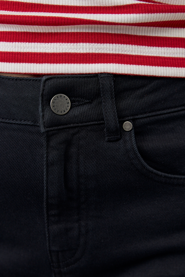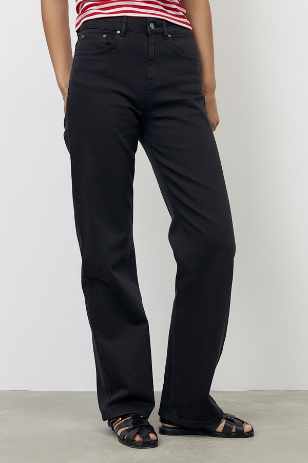 Брюки из эластичного денима выполнены по классической джинсовой технологии. Прямой классический крой. На задней части брюк выполнены накладные карманы, на передней - карманы с подкройным бочком. Притачной пояс со шлёвками. Застёжка на молнию-гульфик и пуговицу.