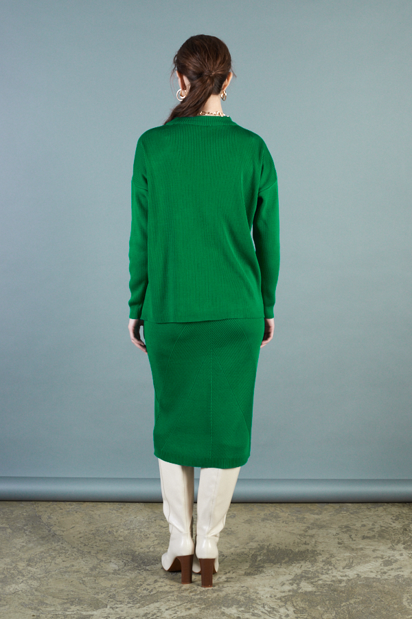 Костюм из джемпера и юбки с фактурным рисунком. Юбка прилегающего силуэта. Пояс с эластичной резиной. Джемпер свободного силуэта. Рукав втачной в спущенную пройму. Вырез горловины оформлен резинкой. Изделие выполнено из мягкой структурированной пряжи.