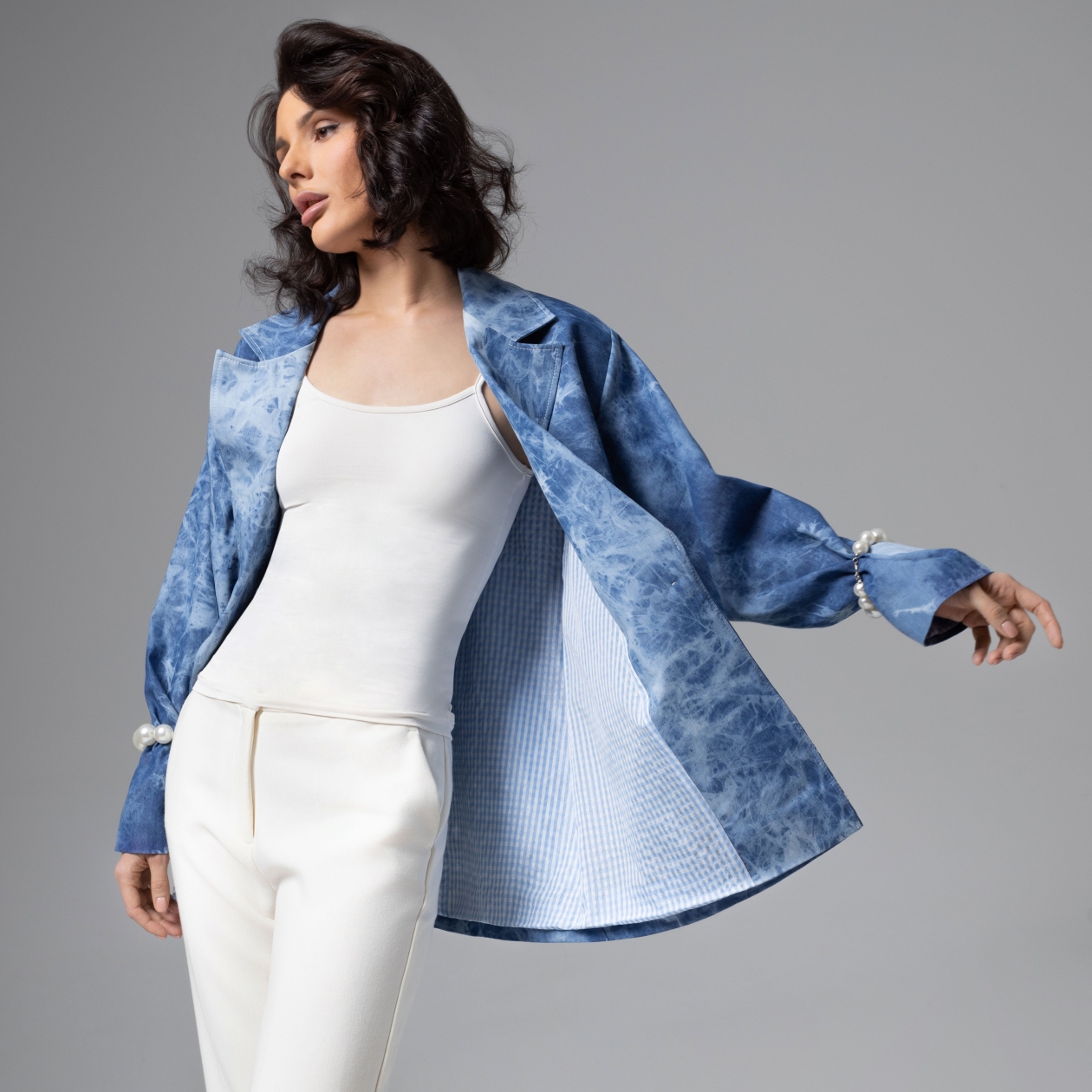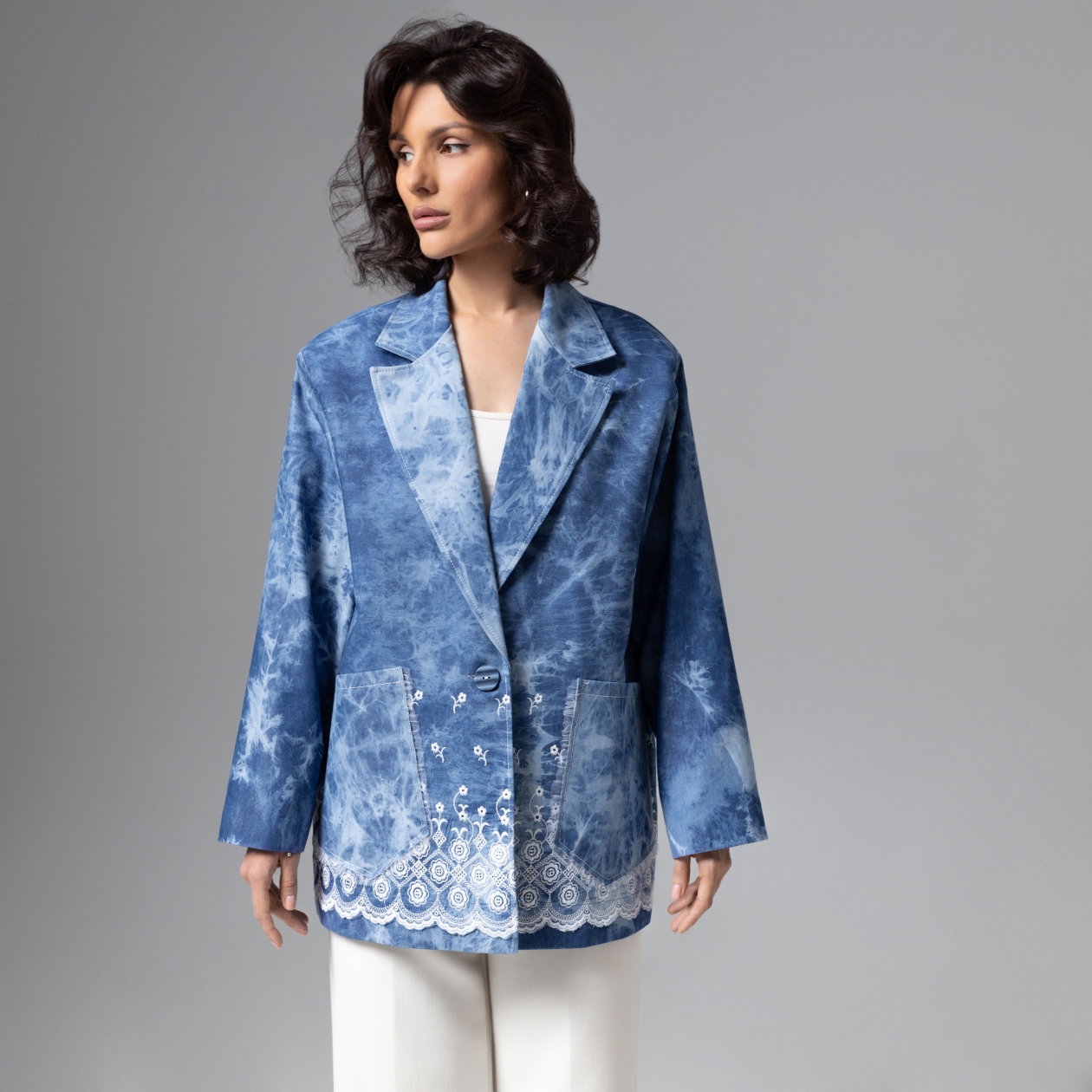 Жакет из премиальной коллекции CHARUTTI из джинсы «тай-дай» хорош как для классических образов, так и для экстраординарных. Выбор за вами. Неизменно только высочайшее качество материала и аккуратный стиль пошива. Жакет однобортный с лацканами в стиле oversize. Жакет с подплечниками. Есть объемные накладные карманы. Эксклюзивная ткань изделия дополнена вышивкой по подолу. Изделие с подкладом.