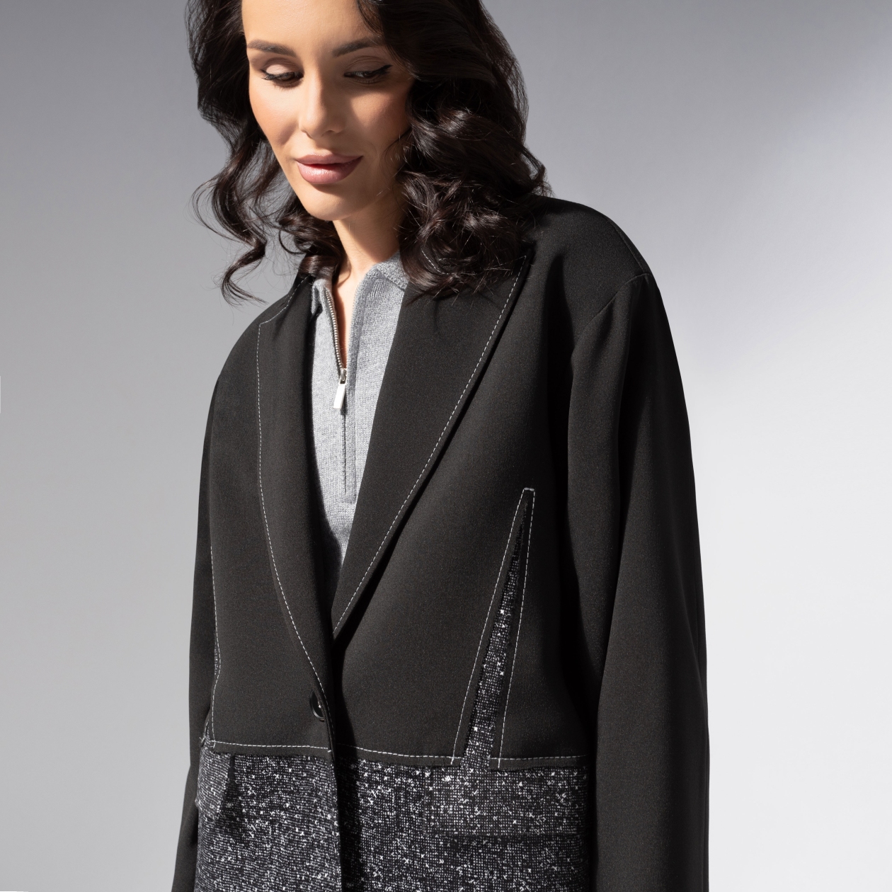 Этот жакет – как шахматная королева: спокойный, но стратегически точный. Дизайнеры ЧАРУТТИ сделали ставку на контраст гладкости и шероховатости, превратив классику в арт-объект. Для тех, кто видит силу в деталях. Модель свободного кроя с геометричными линиями и контрастной нижней вставкой. Сочетание трёх тканей: «пикачо», флак и «плат кагзи». Одинарная застёжка, английский воротник, декоративные швы. Жакет свободной посадки на подкладе с подплечниками.