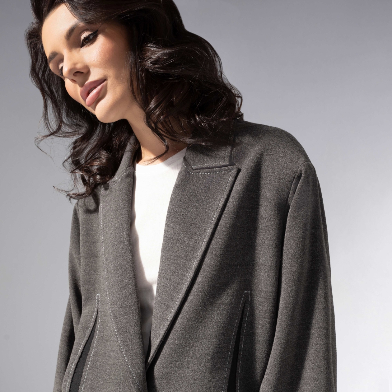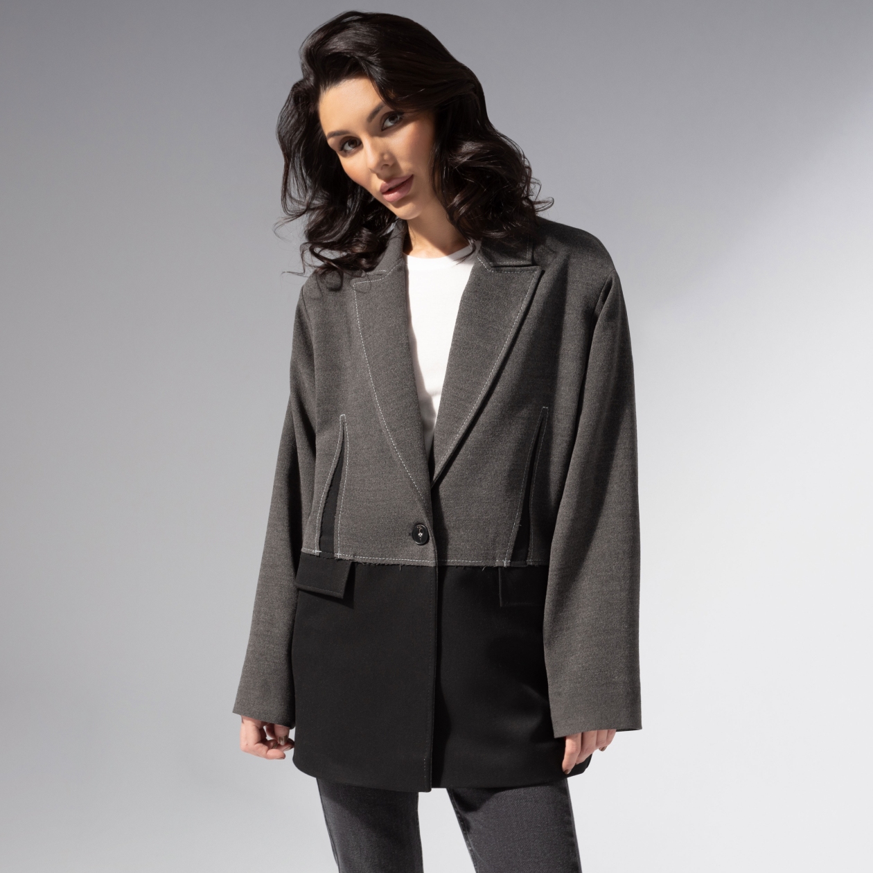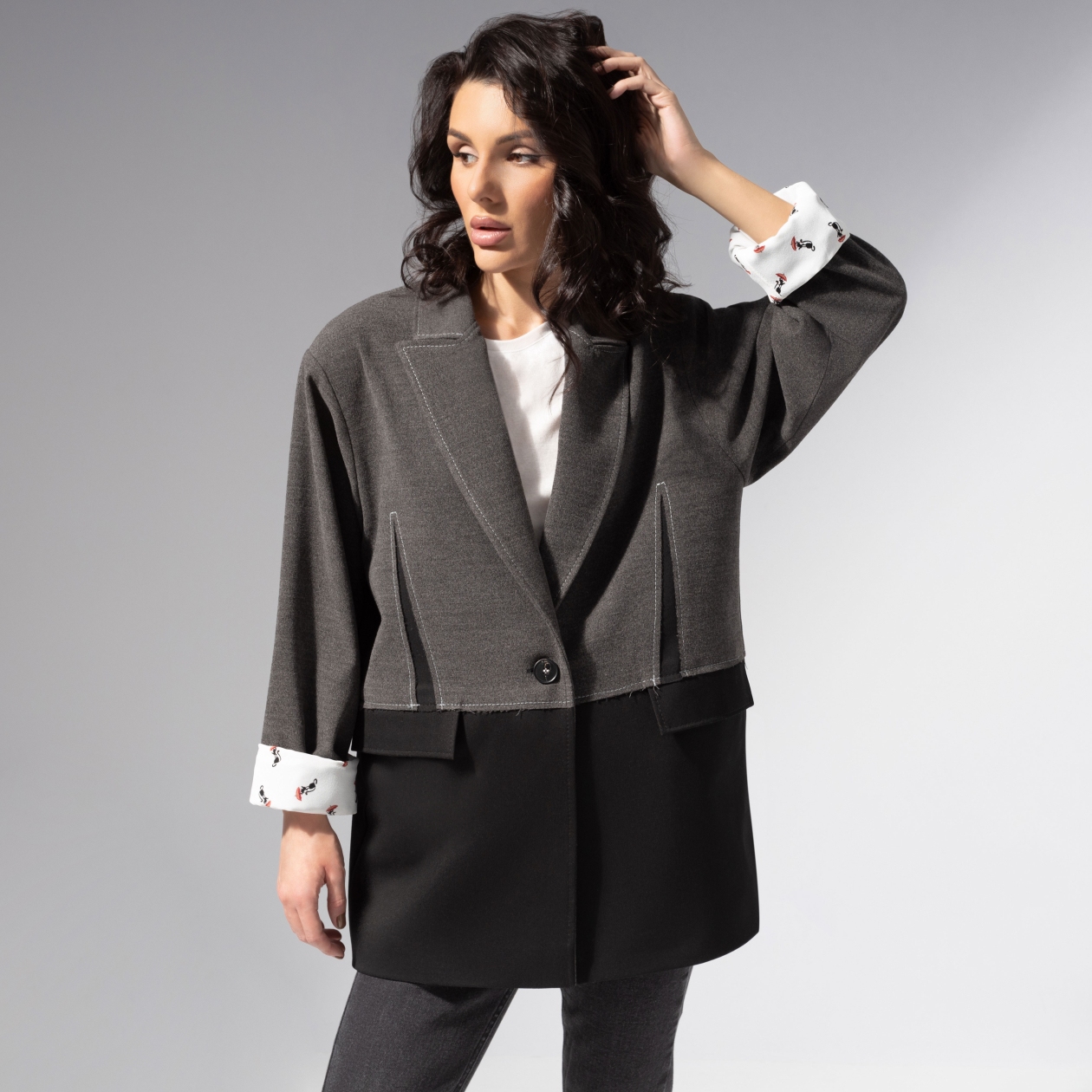 В жизни, как в шахматах, решительный ход делает сильная фигура. Жакет ЧАРУТТИ – про уверенность и умение управлять вниманием. Монохром, игра фактур и архитектурный крой – всё, что нужно для победного образа. Комбинированный жакет из двух видов костюмной ткани. Чёткая линия плеч, свободный силуэт, застёжка на одну пуговицу. Акцентные швы и геометричные вставки.