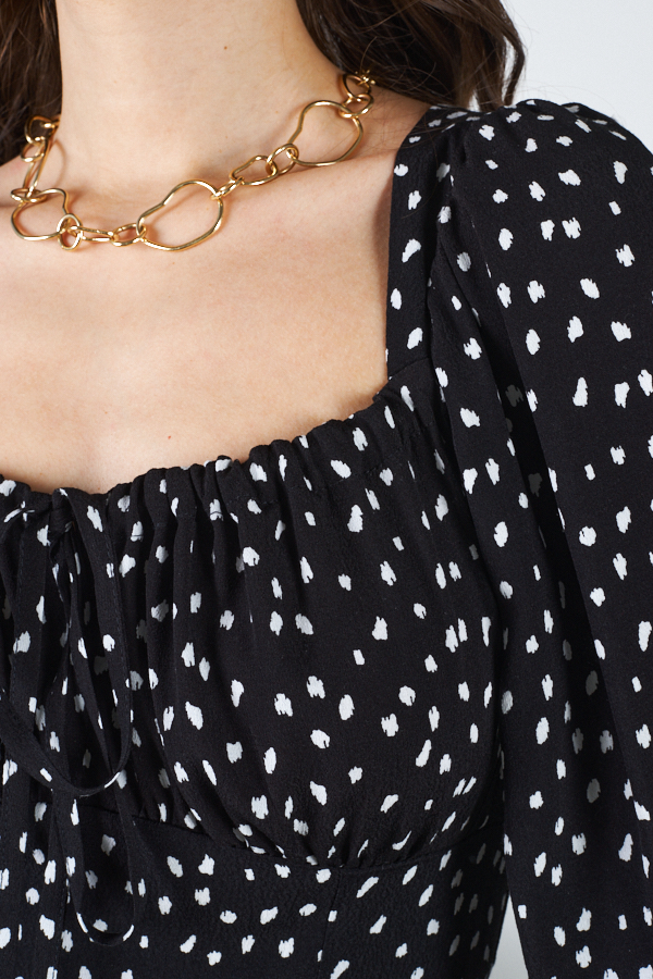 Платье приталенного силуэта, расширенное книзу из вискозной ткани. Отрезное по линии талии. Верхняя часть с отрезным лифом, подрез фигурный. По верхнему краю лифа кулиска, в которую вставлены бретели-завязки, формирующие драпировку. Вырез горловины глубокий, расширенный, по форме напоминающий каре, с вырезом до линии подреза. В верхней части среднего шва спинки застежка на потайную молнию. Рукава втачные, длинные, со сборкой по окату и низу рукава. В подгибку низа рукава вставлена резинка.