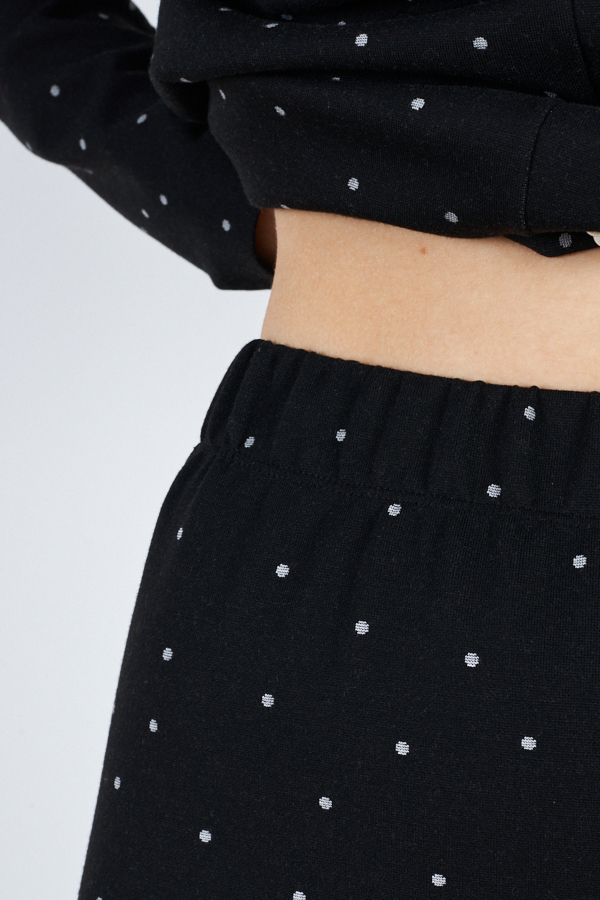 Костюм выполнен из эластичного полотна с жаккардовым узором "горох". Юбка прилегающего силуэта. Сзади по среднему шву небольшой разрез. Пояс с эластичной резиной. Кардиган свободного силуэта с притачной планкой и застёжкой на пуговицы. Втачной длинный рукав в спущенную пройму.