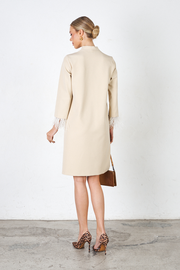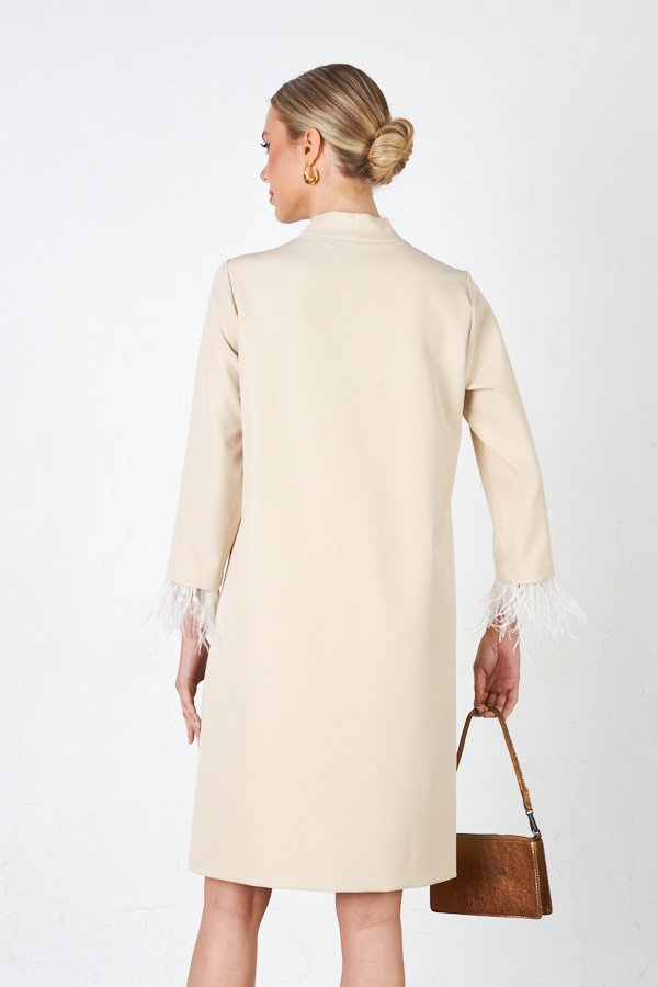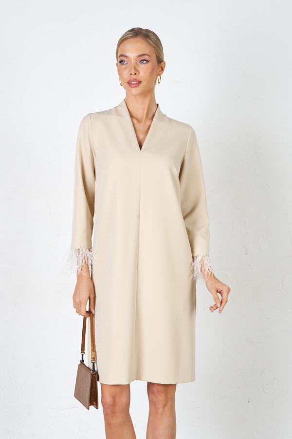 Платье свободного силуэта из плательной ткани. По центру передней части изделия выполнен шов. Цельнокроеная стойка, переходящая в V-образный вырез горловины, визуально делает фигуру стройнее. Втачной длинный рукав. Низ рукава украшен декоративным элементом, который при желании можно отстегнуть.