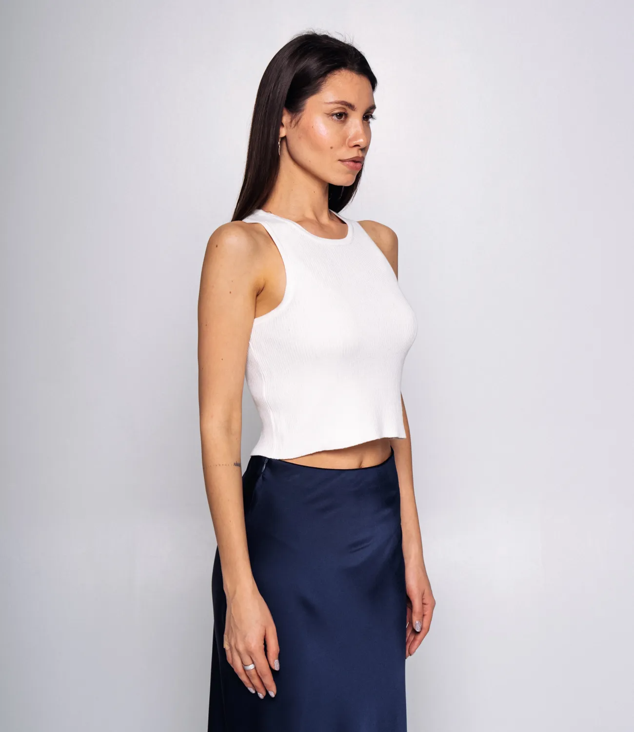 Облегающая посадка делает этот топ абсолютно универсальным. Трикотажный топ является замечательным трендом летнего сезона, который легко комбинировать с разными стилями.