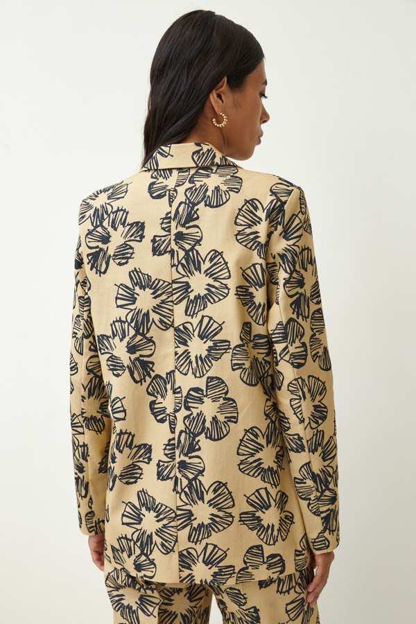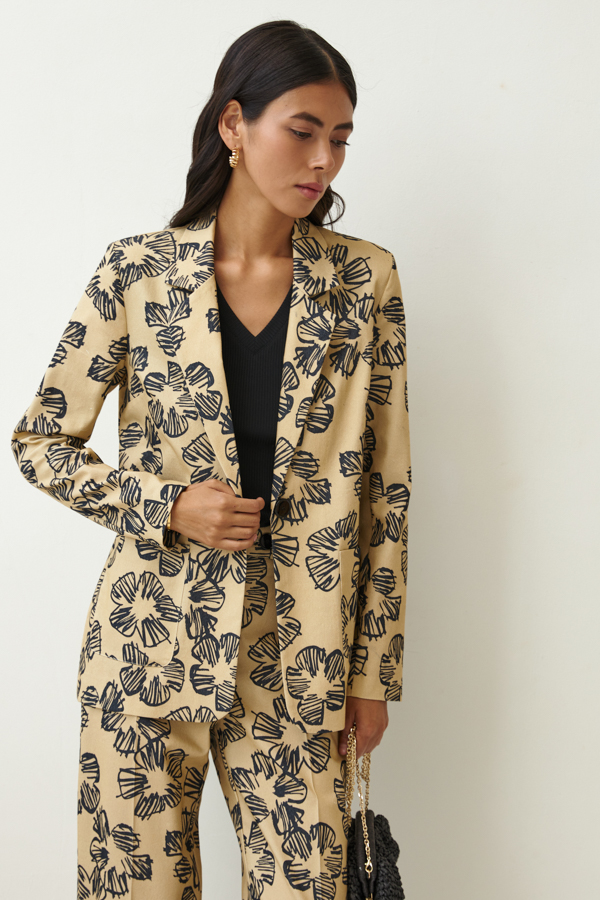 Костюм из хлопковой ткани. Жакет прямого силуэта с английским воротником. На передней части жакета застежка на пуговицу и накладные карманы. Втачной длинный рукав. Изделие имеет четкую линию плеча благодаря плечевым накладкам. Брюки прямого силуэта. На передней части брюк застрочены стрелки. Притачной пояс. Застёжка на молнию-гульфик и пуговицу.