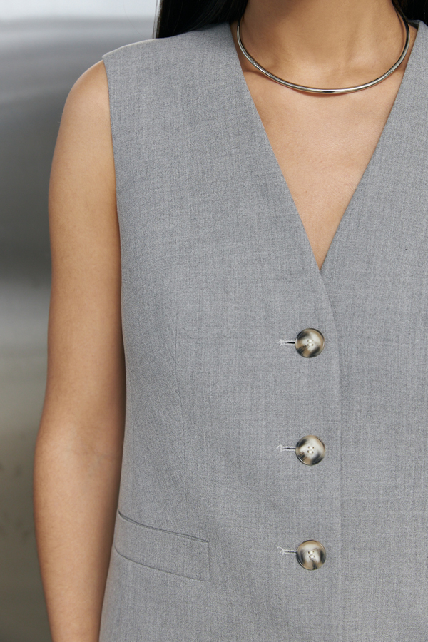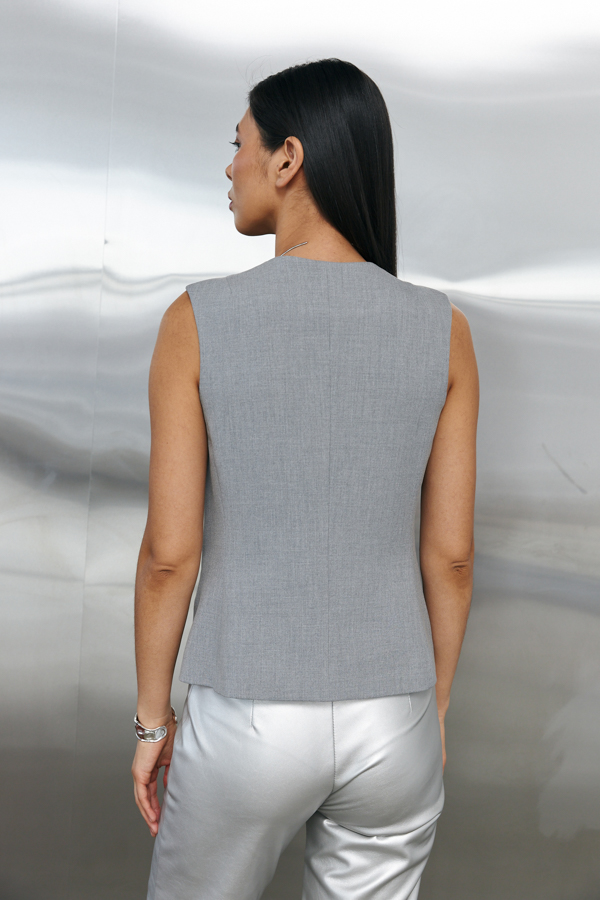 Жилет полуприлегающего силуэта с застёжкой на пуговицы из костюмной ткани. На передней части изделия нагрудные вытачки переведены в рельефы и линию кармана. Карманы прорезные, с листочкой. Спинка со средним швом, рельефами и плечевыми вытачками. Длина жилета до уровня линии бедер. Жилет на притачной подкладке.