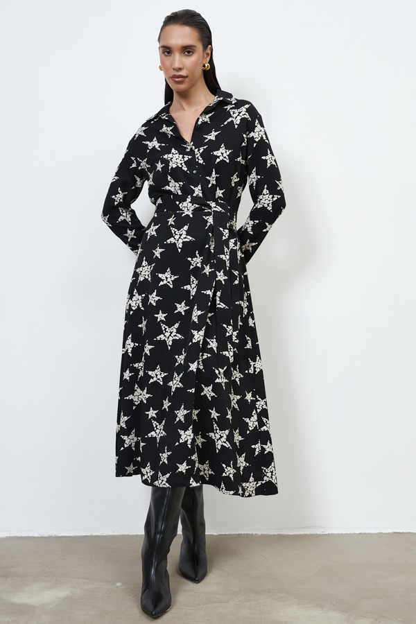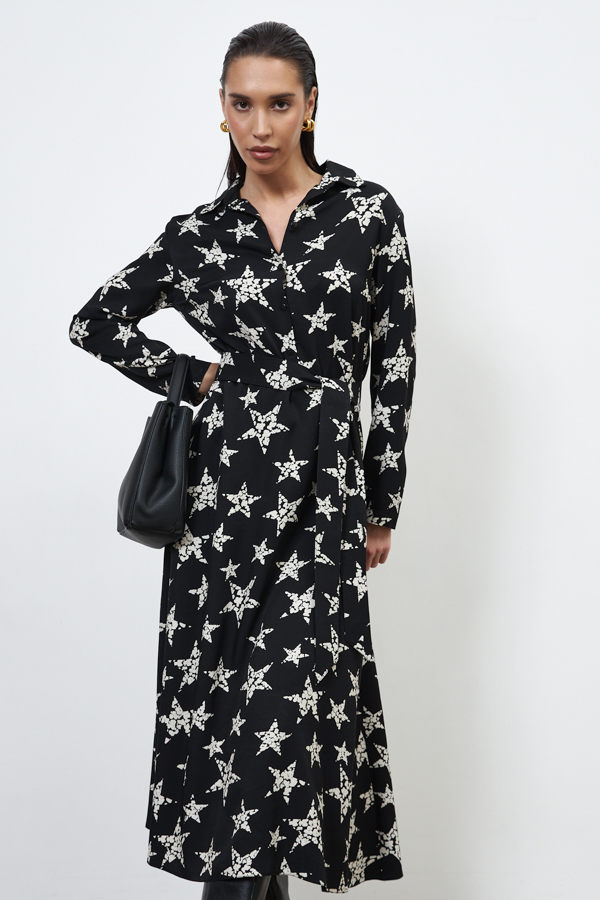 Платье полуприлегающее в области груди и свободное в области бедер из вискозной ткани. Изделие отрезное по линии талии. Лиф с застёжкой на пуговицы. Вырез горловины обработан отложным воротником на стойке. Втачной длинный рукав. В комплекте пояс из основной ткани.