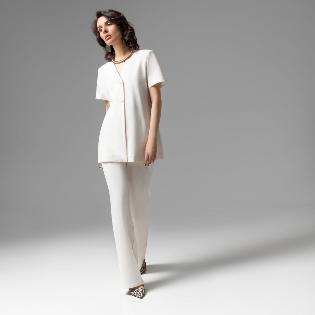 Олицетворение утонченности стиля old money. Изготовлен из высококачественной костюмной ткани по тщательно выверенным лекалам. Безупречная посадка дополнена акцентной фурнитурой. Костюмный ансамбль гарантирует комфорт движений. Используйте детали в виде шелкового платка или длинных бус, чтобы дополнить образ. Комплект состоит из блузы прямого кроя с коротким рукавом и широких прямых брюк. Акцентная деталь по спинке в виде вшитого пояса. Есть разрезы по боковым сторонам изделия. Высокая посадка брюк на талии на резинке. Брюки с карманами.