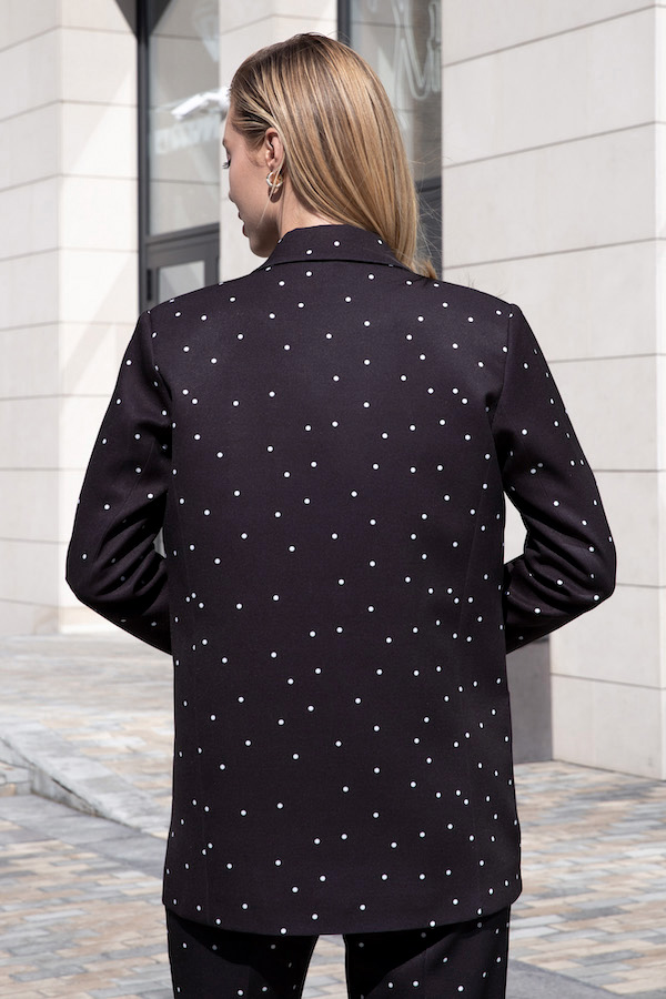 Жакет полуприлегающего силуэта из костюмной ткани. Изделие с английским воротником и застежкой на пуговицу. На передней части жакета выполнен нагрудный карман с листочкой и карманы в рамку с клапаном. По центру задней части выполнена шлица - элемент декоративный и необходимый. Обеспечивает свободу движения, добавляет шику и элегантности. Втачной длинный рукав, снизу имитация шлицы с пуговицами. Изделие идеально держит форму, имеет четкую линию плеча благодаря плечевым накладкам. Жакет на подкладке.