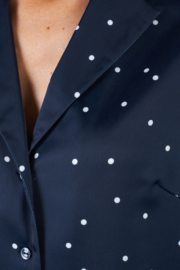 Костюм из атласной плательно-блузочной ткани. Блуза свободного силуэта с английским воротником. Английский воротник визуально сделает фигуру стройнее, скроет недостатки и подчеркнет красивую линию груди. На передней части изделия застежка на пуговицы. Втачной длинный рукав. Брюки прямого силуэта. Пояс притачной с эластичной резиной, в боковых швах карманы.