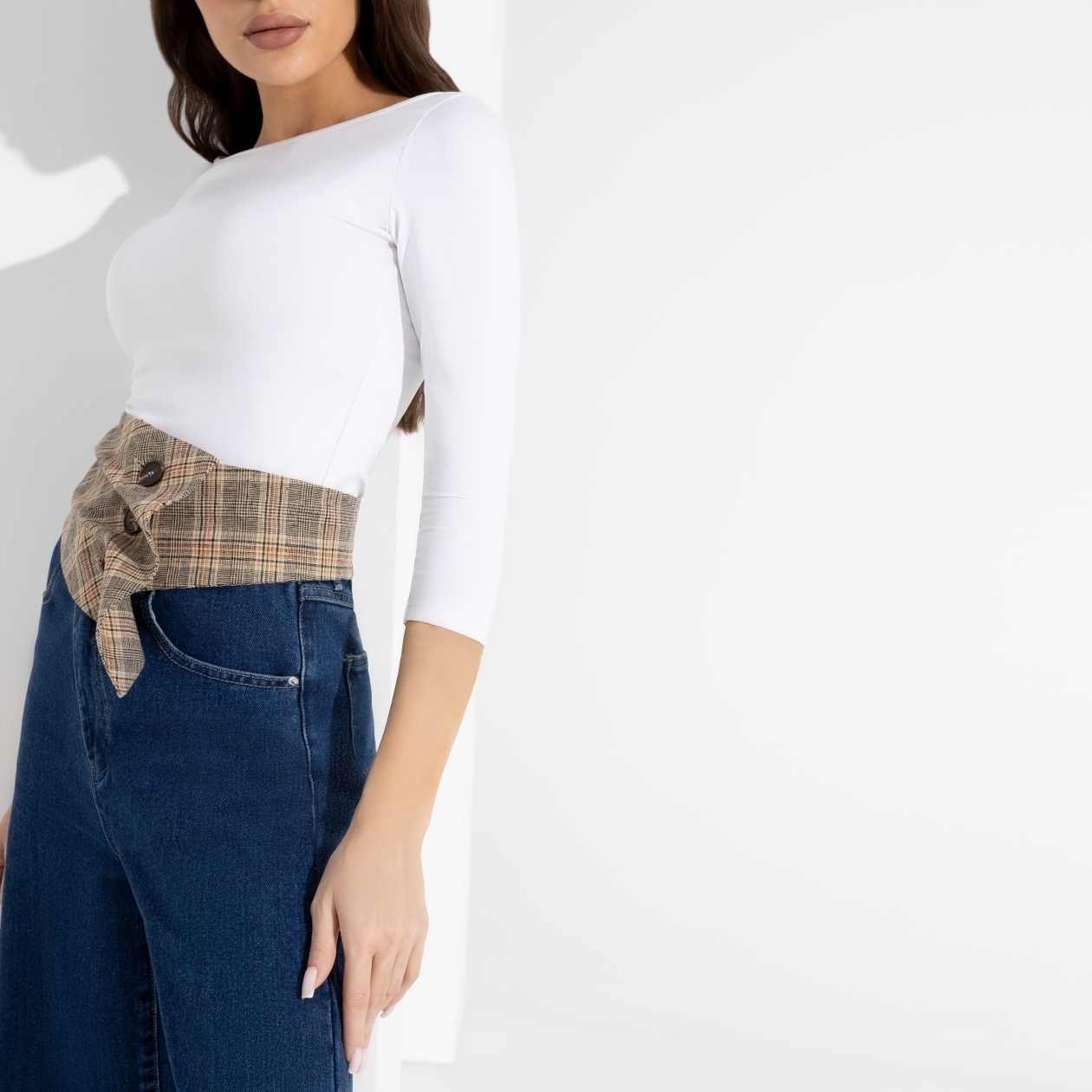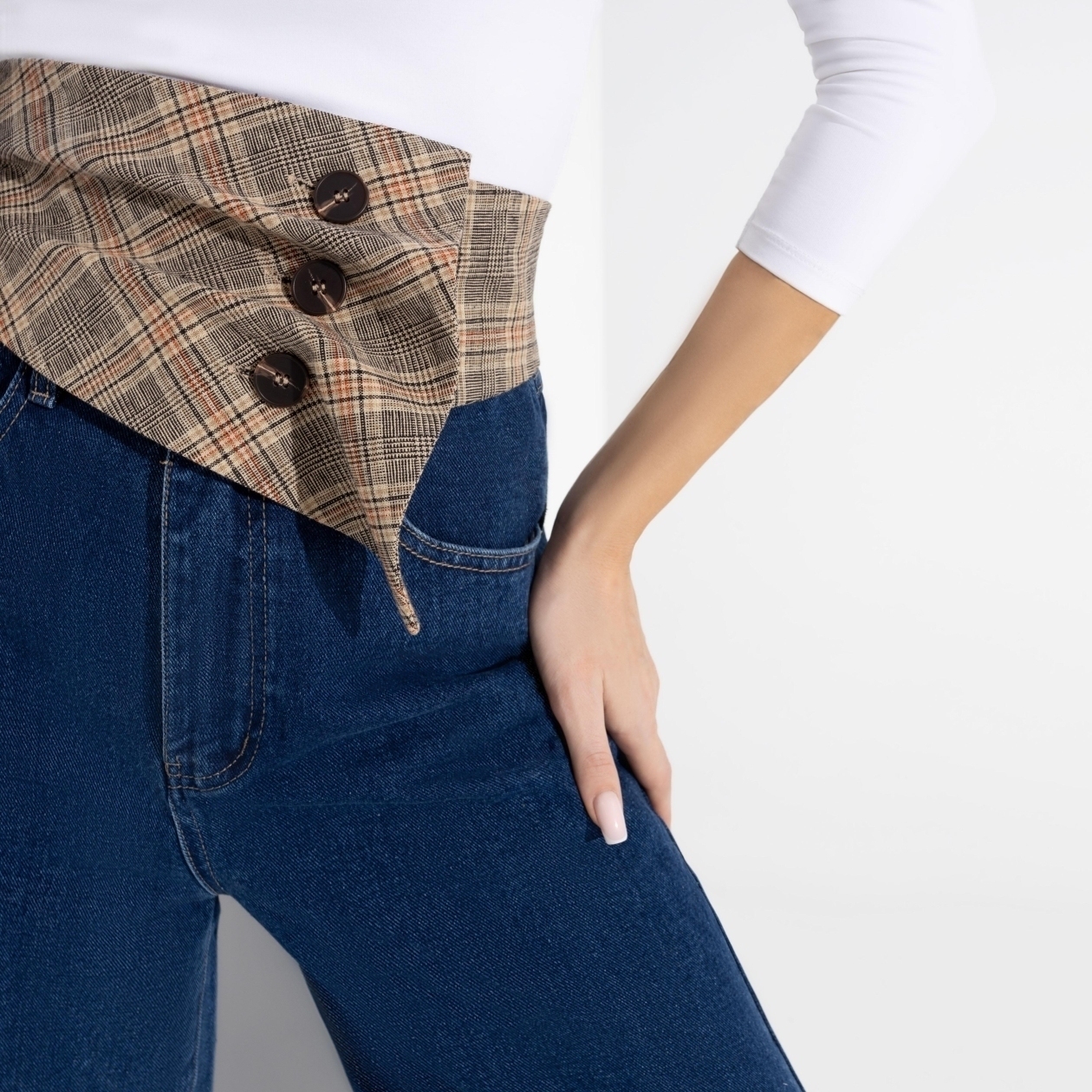 Акцент на талию! Асимметричный пояс с трендовым принтом «шотландка» - сам по себе уже очень яркая и сочная деталь. Рекомендуем добавить его к однотонной водолазке, джинсам или платью спокойного тона.