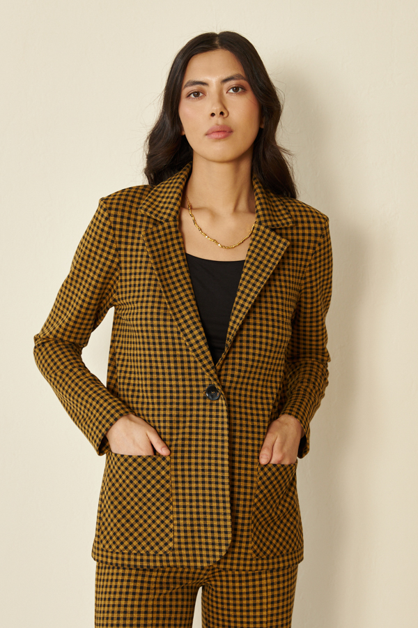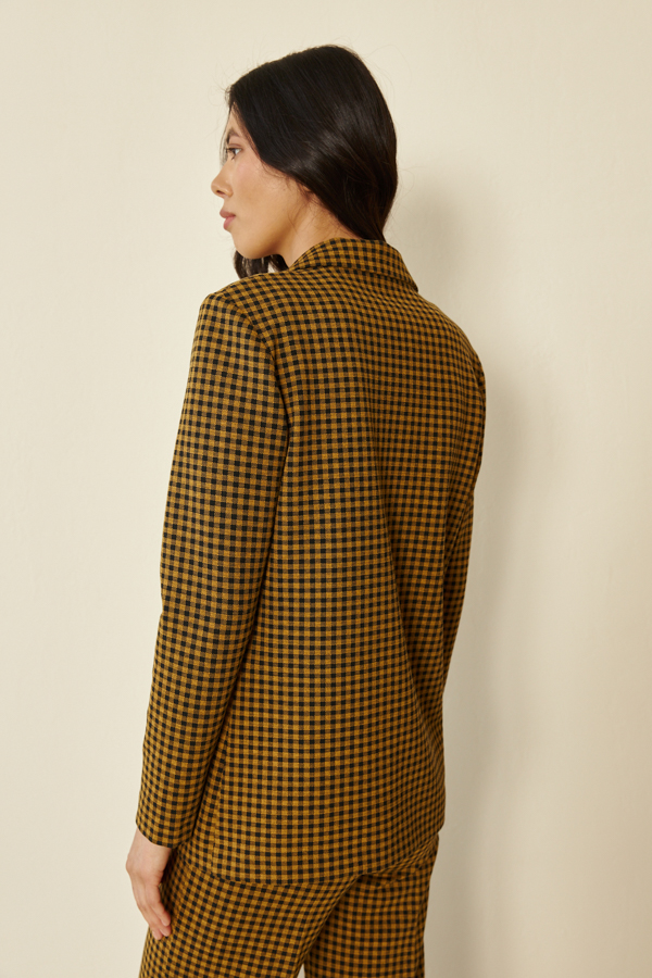 Костюм выполнен из эластичного полотна с жаккардовым узором "клетка". Брюки прямого силуэта. На передней части брюк застрочены стрелки. Пояс притачной с эластичной резиной. Жакет прямого силуэта с английским воротником и накладными карманами. На передней части жакета застежка на пуговицу. Втачной длинный рукав. Изделие с плечевыми накладками, которые при желании можно убрать.
