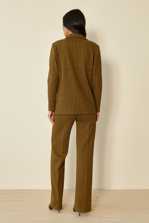 Костюм выполнен из эластичного полотна с жаккардовым узором "клетка". Брюки прямого силуэта. На передней части брюк застрочены стрелки. Пояс притачной с эластичной резиной. Жакет прямого силуэта с английским воротником и накладными карманами. На передней части жакета застежка на пуговицу. Втачной длинный рукав. Изделие с плечевыми накладками, которые при желании можно убрать.