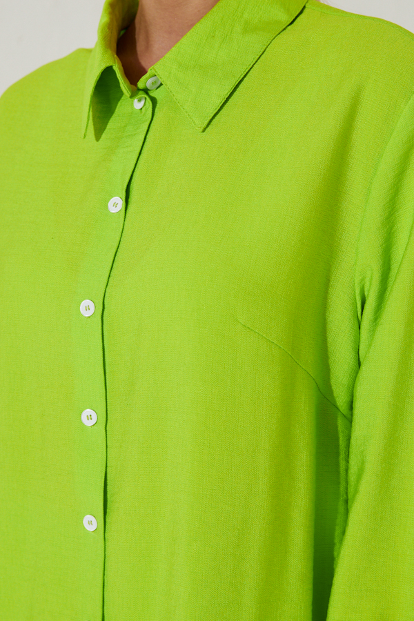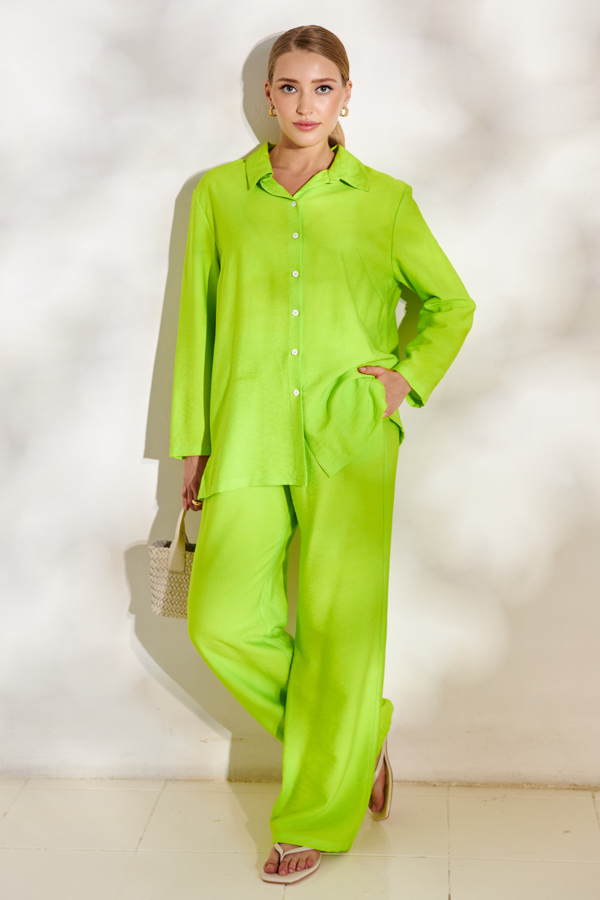 Костюм из вискозной ткани с крэш-эффектом. Рубашка свободного силуэта с разрезами в боковых швах и застёжкой на пуговицы. Рубашечный рукав. Вырез горловины обработан отложным воротником на стойке. На задней части изделия выполнена кокетка с небольшой складкой. Брюки прямого силуэта из вискозной ткани с крэш-эффектом. Пояс притачной с эластичной резиной, в боковых швах карманы.