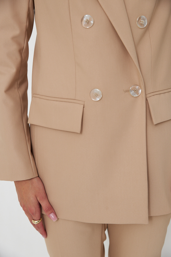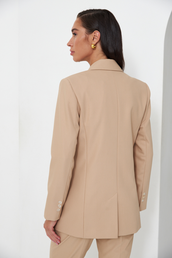 Двубортный жакет из костюмной ткани. Изделие полуприлегающего силуэта с английским воротником и застежкой на пуговицы. На передней части жакета выполнен нагрудный карман с листочкой и карманы в рамку с клапаном. По центру задней части выполнена шлица - элемент декоративный и необходимый. Обеспечивает свободу движения, добавляет шику и элегантности. Втачной длинный рукав, снизу имитация шлицы с пуговицами. Изделие идеально держит форму, имеет четкую линию плеча благодаря плечевым накладкам. Жакет на подкладке.