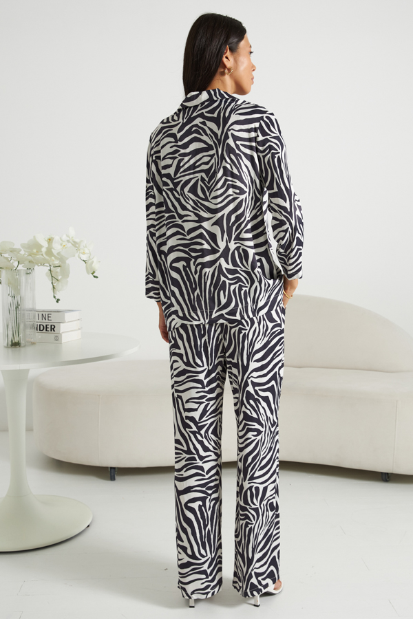 Костюм из атласной плательно-блузочной ткани. Блуза свободного силуэта с английским воротником. Английский воротник визуально сделает фигуру стройнее, скроет недостатки и подчеркнет красивую линию груди. На передней части изделия застежка на пуговицы. Втачной длинный рукав. Брюки прямого силуэта,.в боковых швах карманы. Пояс притачной с эластичной резиной.