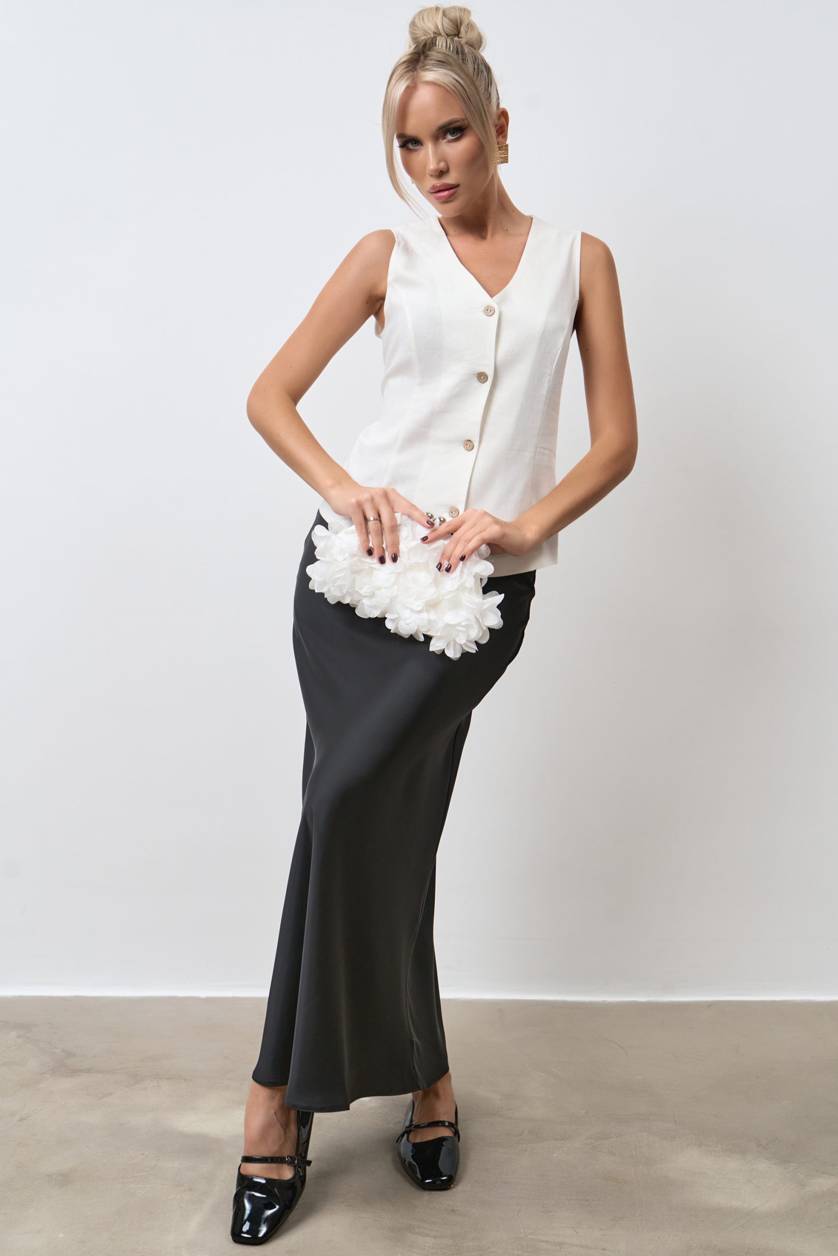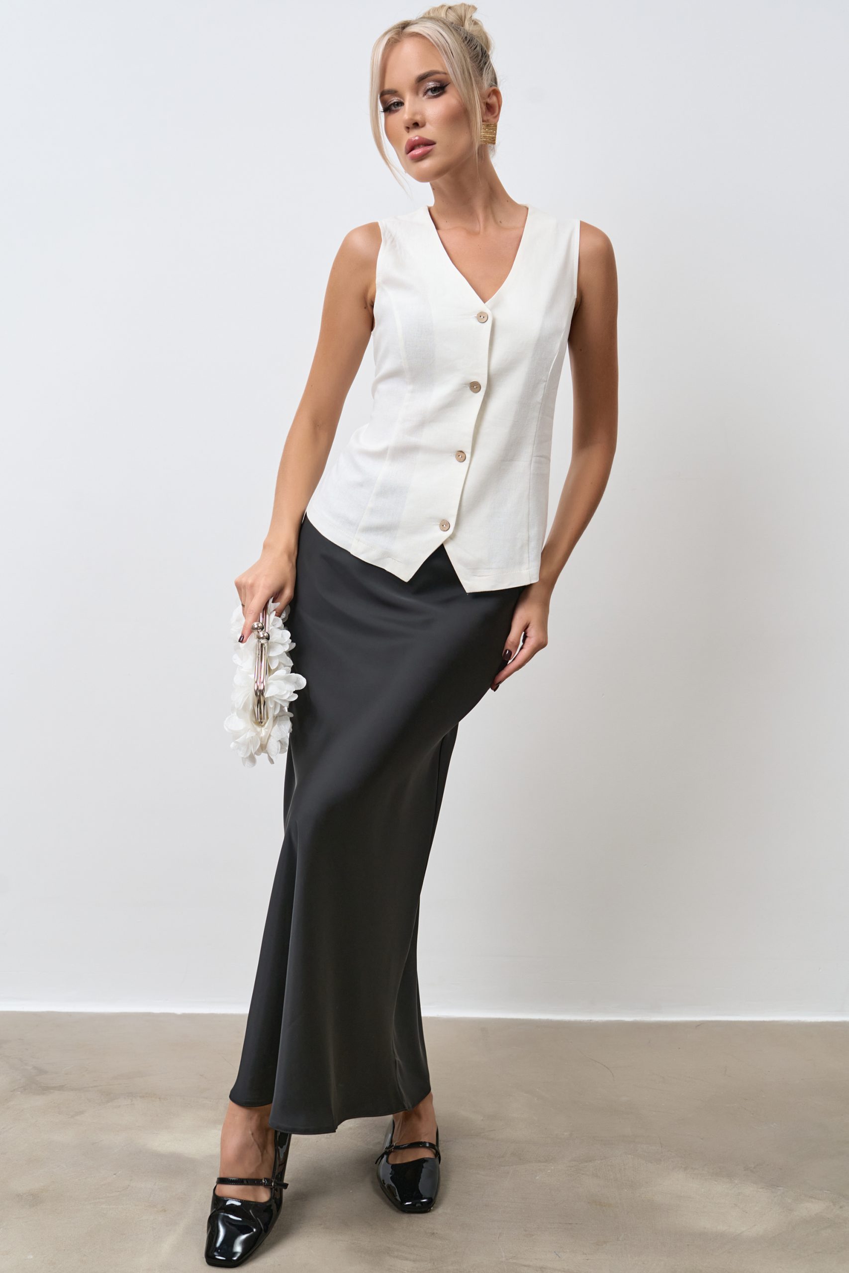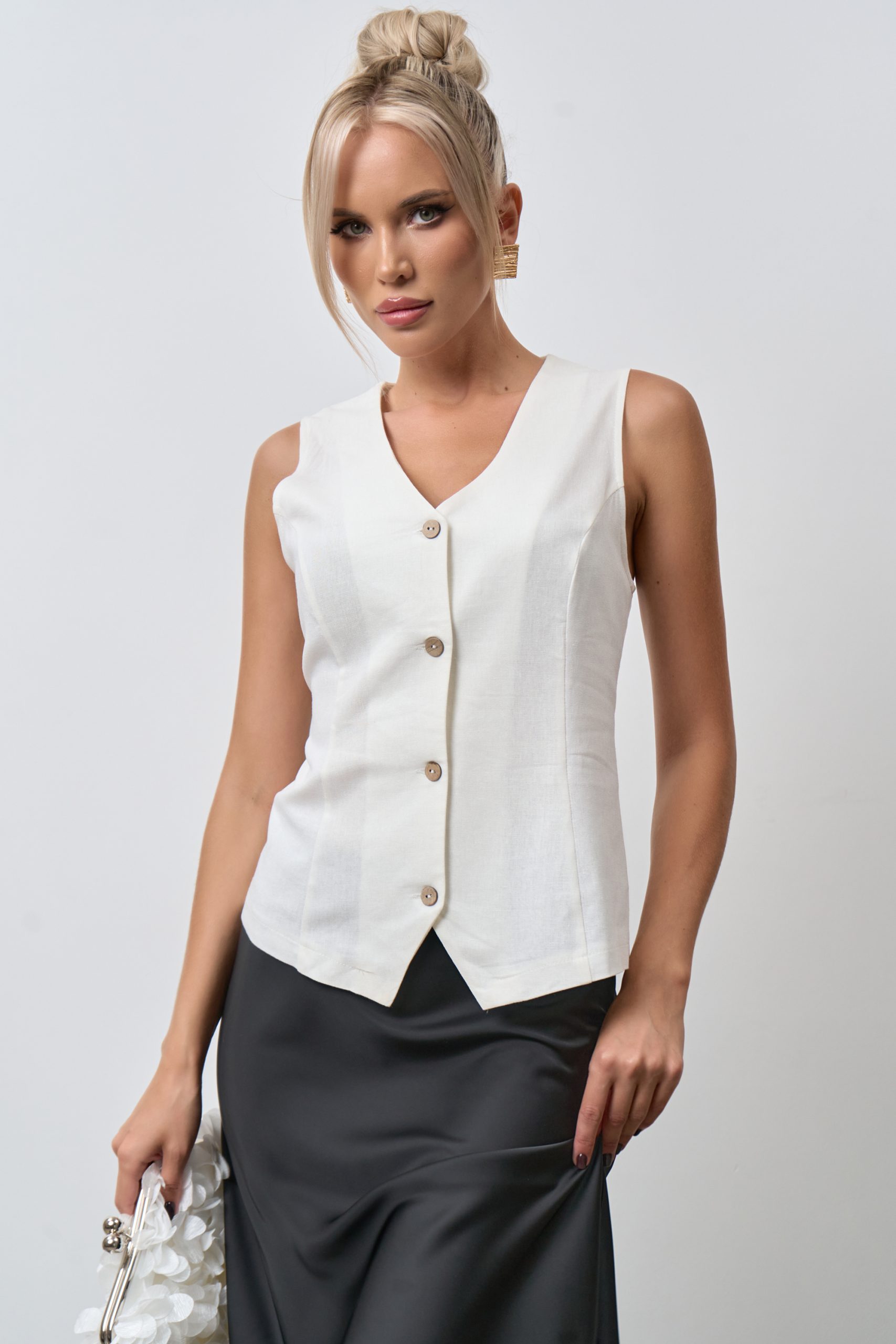 Если вы ищете универсальную вещь, которая придаст образу свежести и стиля, этот жилет — идеальный выбор. Он добавит изысканности даже самым простым сочетаниям. Лёгкий жилет без рукавов имеет V-образный вырез и застёжку на пуговицы. Крой прямой, чуть свободный, что делает его комфортным даже в жаркую погоду.