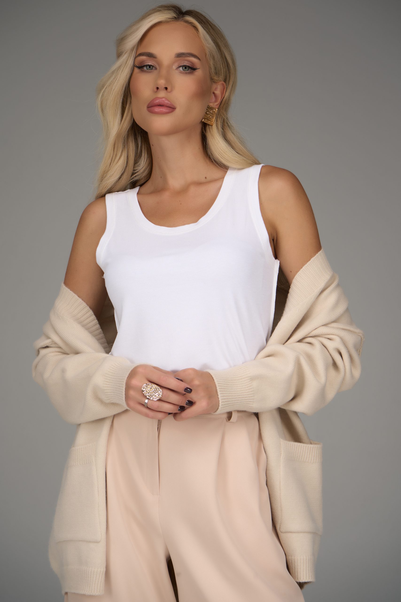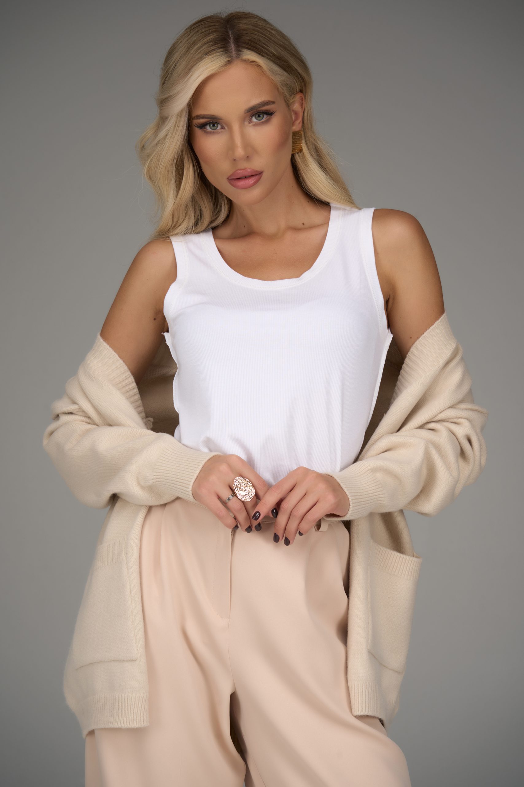 Современный и универсальный трикотажный топ станет идеальным дополнением вашего гардероба. Мягкая, приятная к телу ткань обеспечивает комфорт на весь день, а аккуратный крой подчёркивает силуэт, не сковывая движений. Минималистичный дизайн делает его легко комбинируемым — носите с офисными брюками, юбкой или любимыми джинсами. Топ доступен в нескольких спокойных оттенках, которые подчеркнут вашу естественную элегантность.