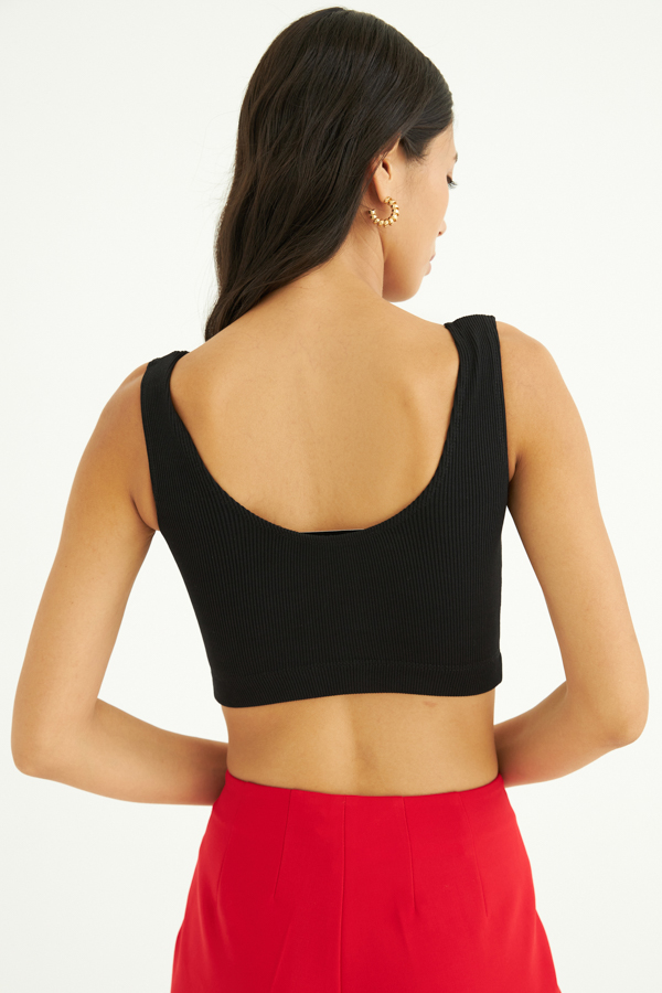 Укороченный топ на лямках из эластичного полотна в рубчик. Прилегающий силуэт. Круглый вырез горловины и линия проймы оформлены бейками.