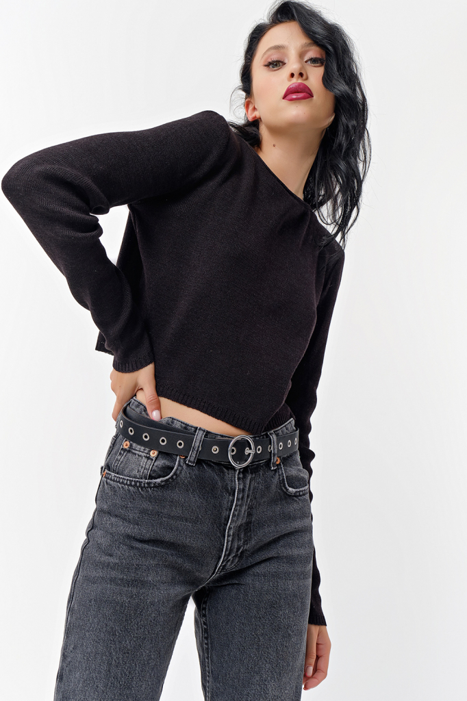 Особенности:  Вязаный укороченый джемпер с содержанием хлопка. Силуэт свободный, прямой. Горловина по типу "лодка" окантован под закрутку.