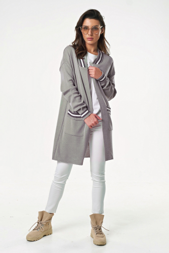 Особенности: Удлиненный кардиган свободного силуэта без застежки. Полочки кардигана обработаны узкой бейкой и оформлены крупными накладными карманами. Рукава и низ изделия украшает широкая резинка в рубчик. По бокам выполнены удлиненные разрезы.