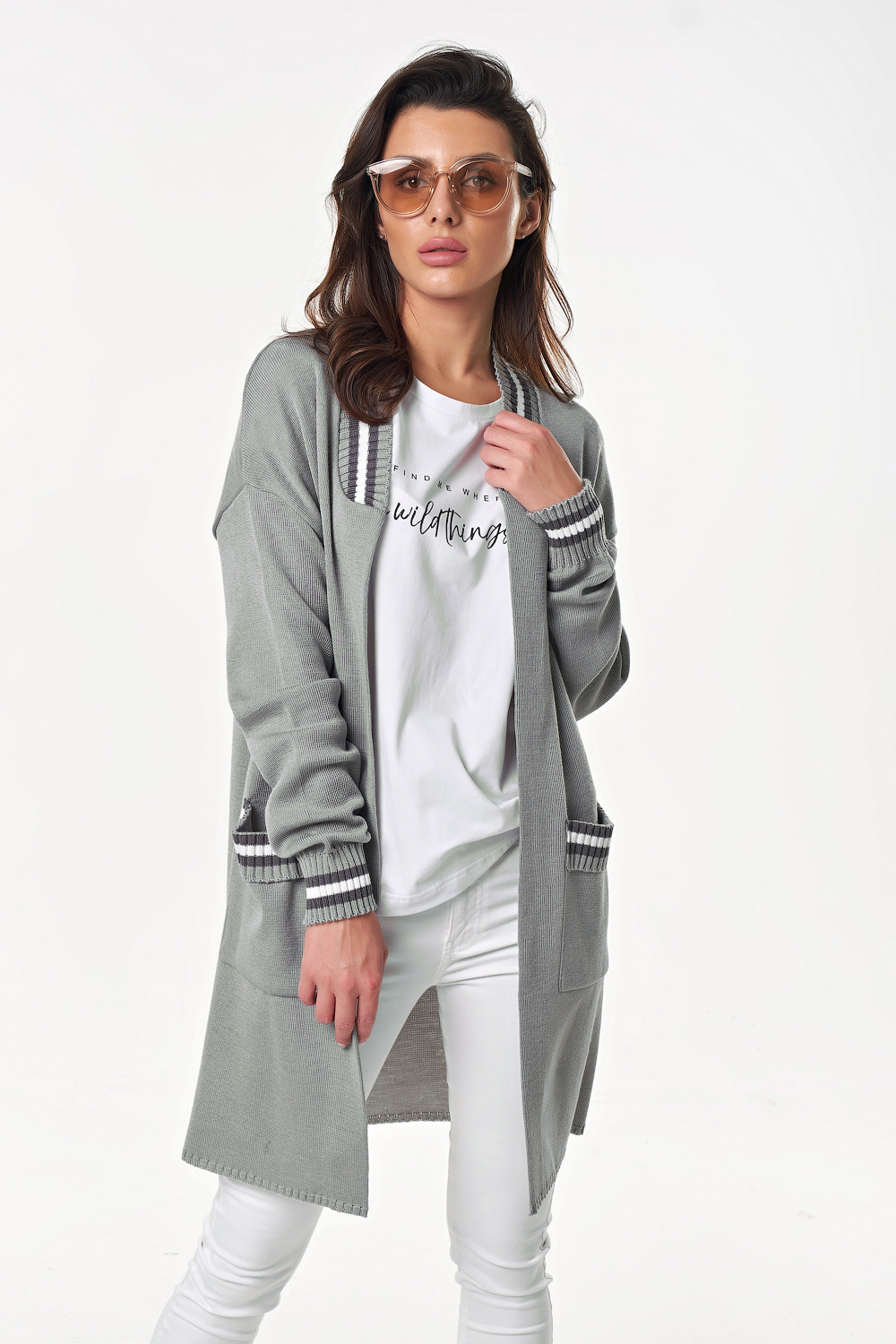 Особенности:  Мягкий тонкий кардиган с контрастной отделкой по рукавам, горловине и на карманах.