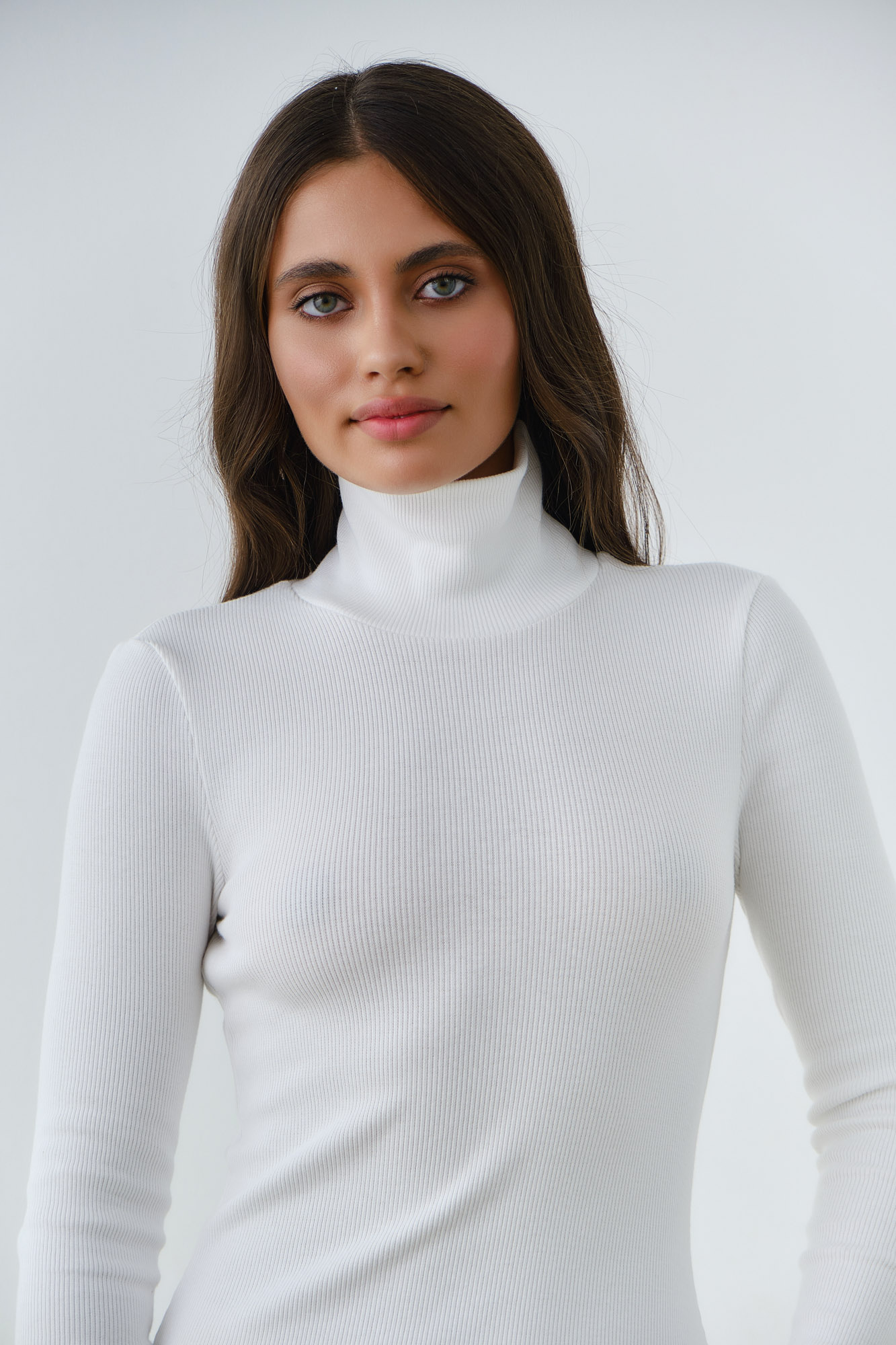 Выполнено из мягкого плотного трикотажа в узкий рубчик.