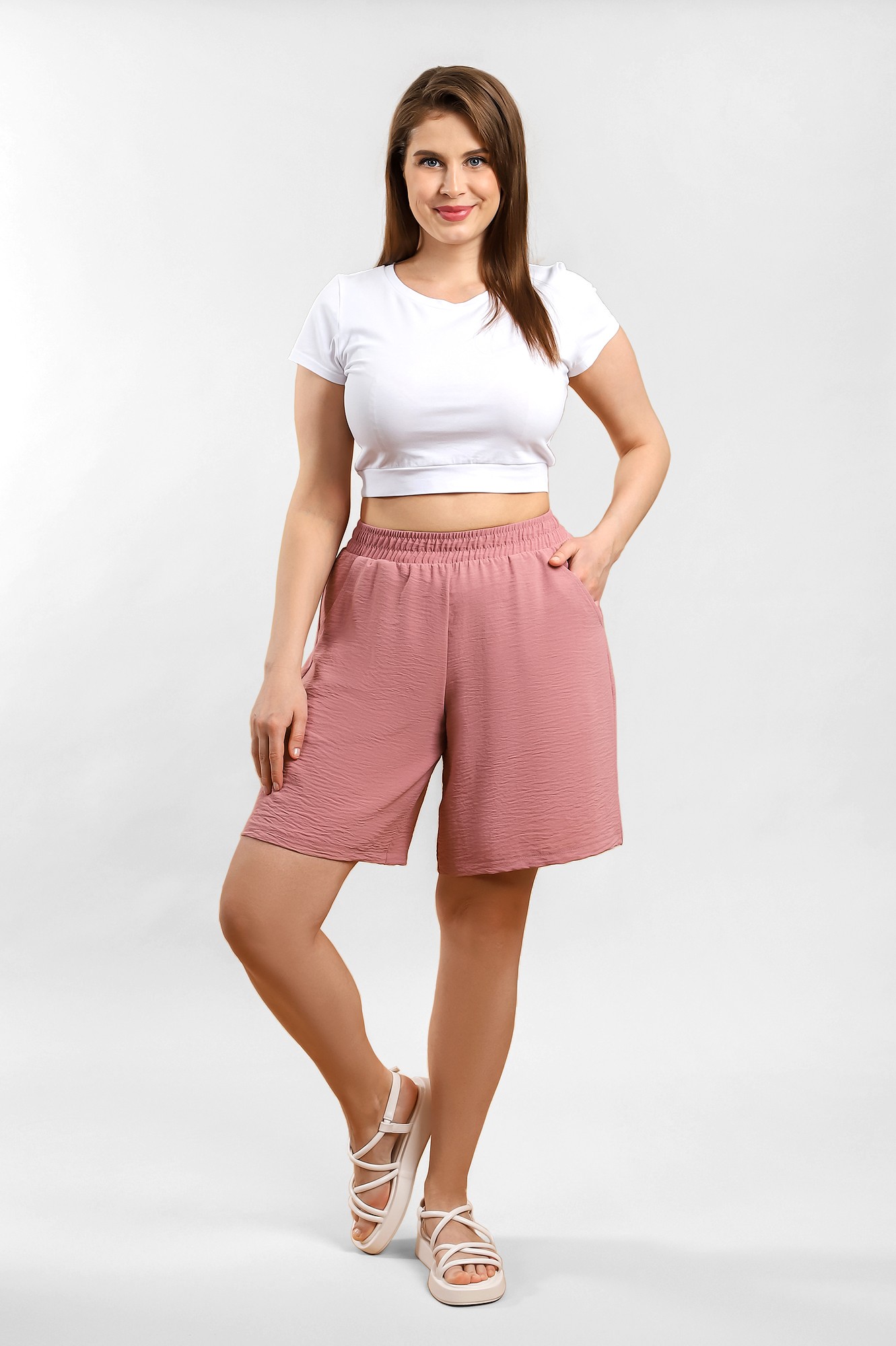 Шорты женские из тканого гладкокрашеного полотна «Лен Манго», свободного покроя средней длины, с карманами в боковых швах, на притачном поясе с эластичной тесьмой внутри.