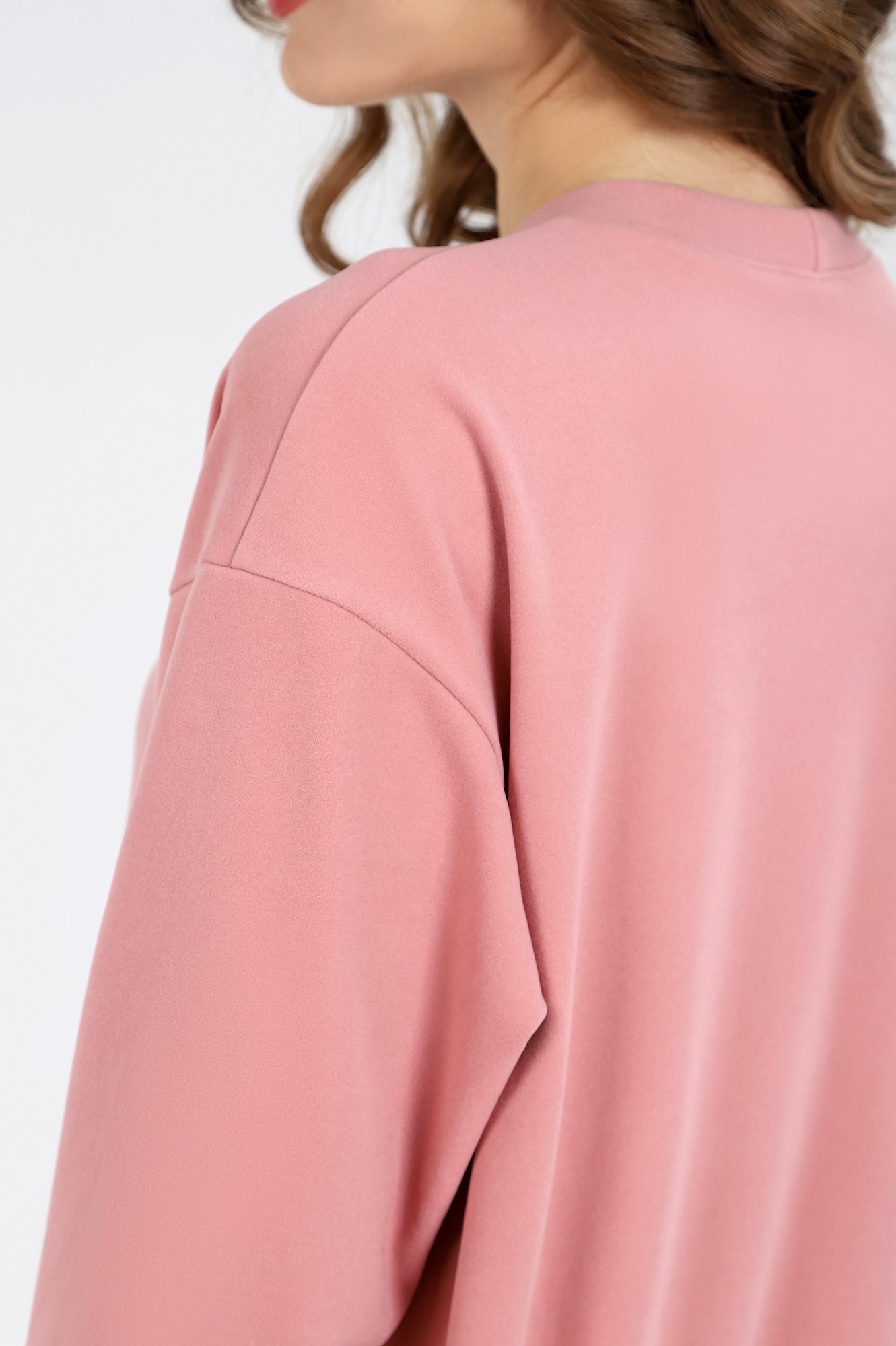 Костюм молодежный из гладкокрашеного трикотажного полотна «флис-сайкл», состоящий из джемпера и брюк. Джемпер – прямого силуэта, с длинными втачными рукавами, горловиной овальной формы, обработанной втачной планкой, притачным поясом понизу и принтом на полочке, выполненным в технике «шелкографии». Рукава – с притачными манжетами.Брюки – длинные, свободные, на притачном поясе с эластичной тесьмой внутри, карманами в боковых швах.