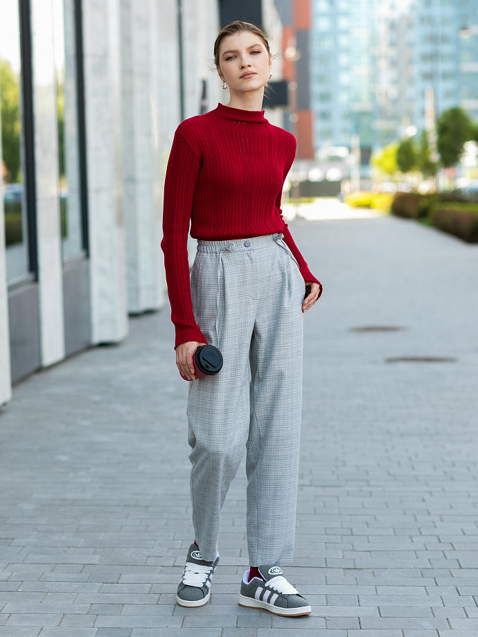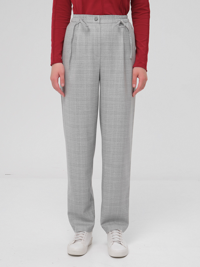 Спереди защипы по талии, прорезные карманы с листочкой и застёжка на молнию и кнопку на поясе. Пояс с резиной и кулисой, в которую вставлены завязки.