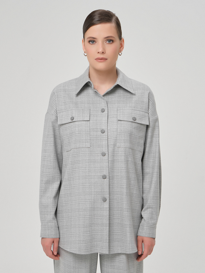 Модель прямого силуэта. Спереди накладные карманы с клапанами и застёжка на кнопки. Спинка с кокеткой, под кокеткой бантовая складка. Воротник сорочечный. По низу рукава защипы, планка и манжета с застёжкой на кнопку. В боковых швах разрезы. Низ жакета закруглён.