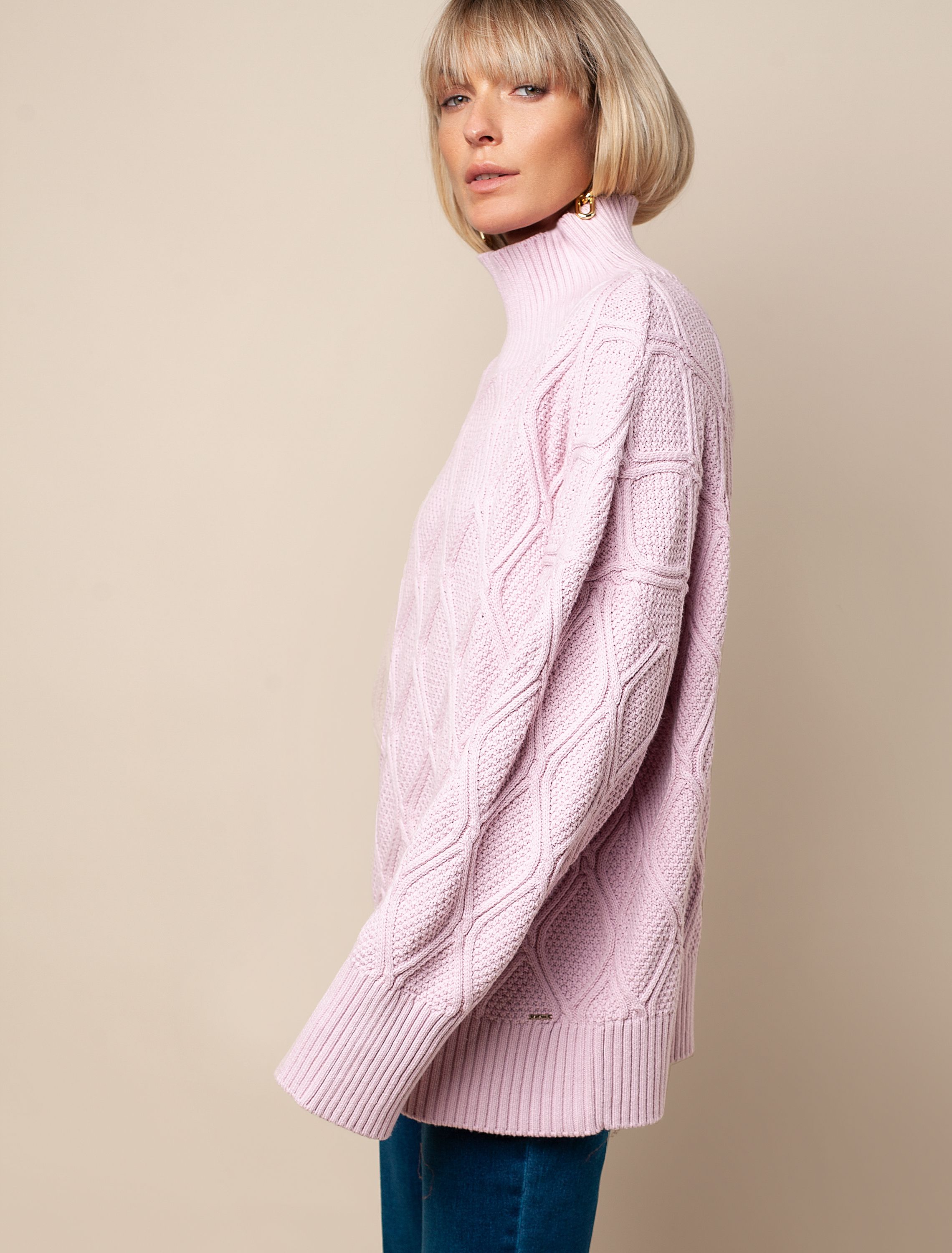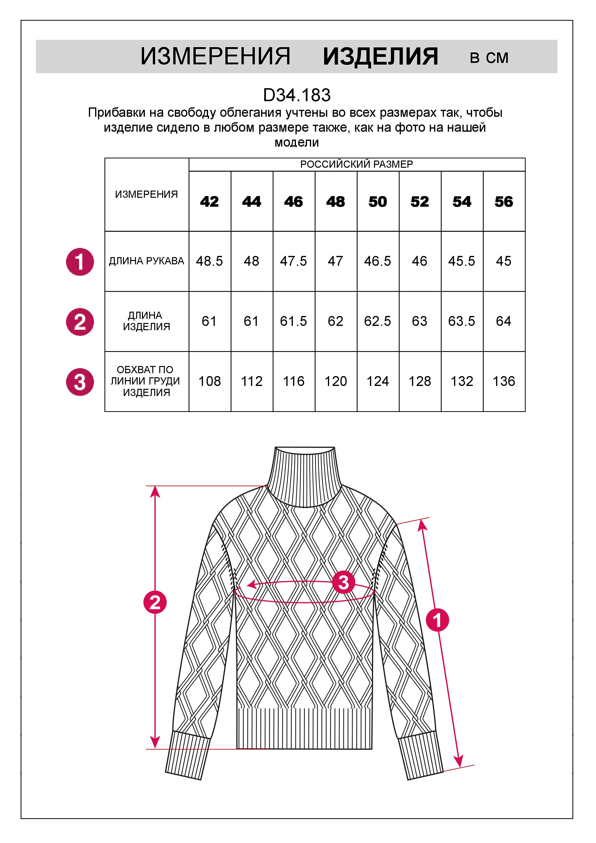 Свитер выполнен из хлопковой пряжи крупной резной вязки. Мягкая фактура свитера очень комфортная к телу, абсолютно не колется и позволяет носить изделие даже на голое тело. Добавление акрила в состав изделия способствует шелковистости и дополнительному теплу. Трендовый геометрический узор отлично впишется в осенне-зимний гардероб.